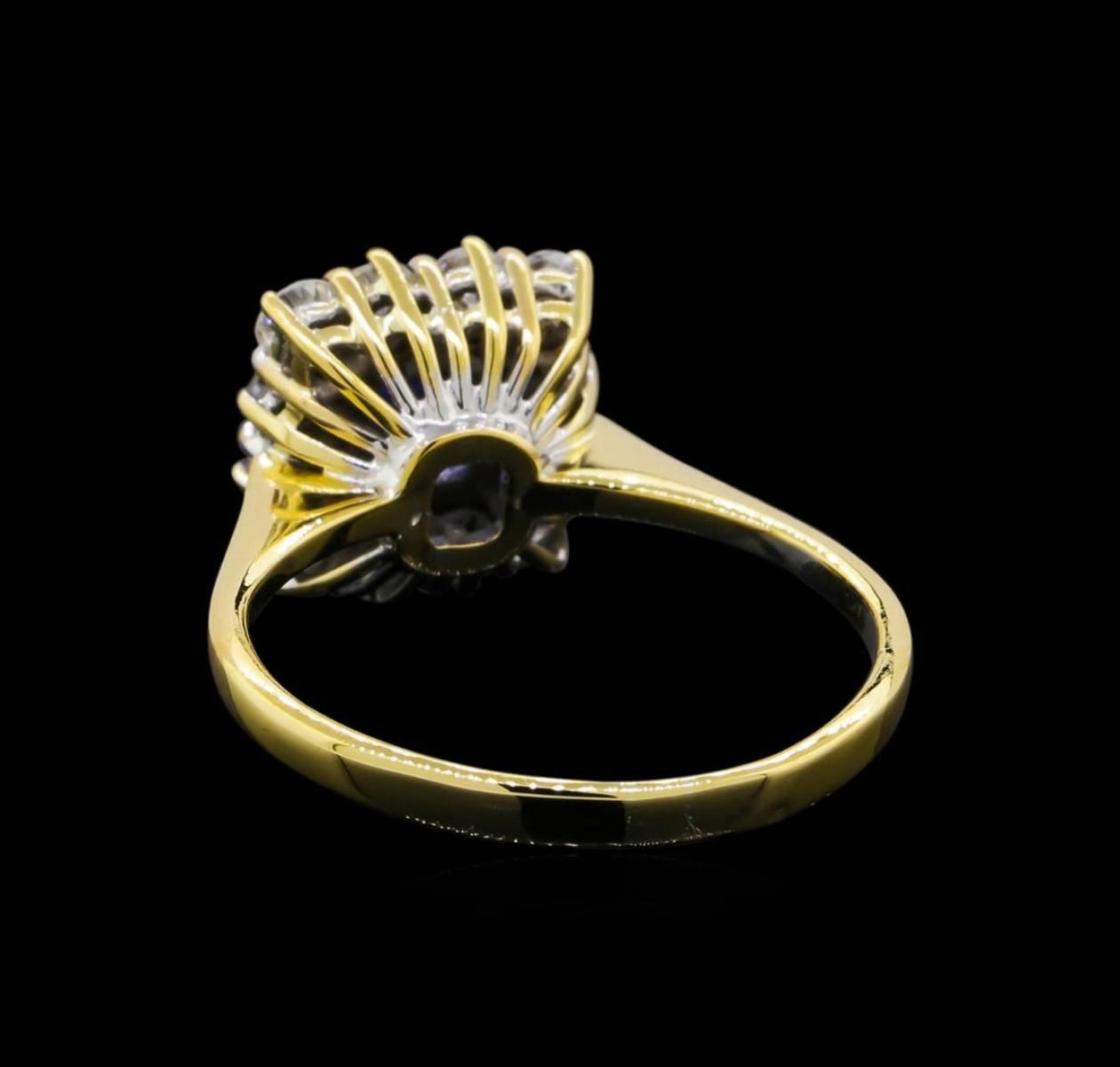 One electronically tested 14KT white gold ladies cast sapphire and diamond ring. The featured sapphire is set within a diamond bezel supported by a ribbed under gallery, completed by a one and one-half millimeter wide band. Bright polish finish with yellow gold overlay. Identified with markings of "14K". Condition is good. Containing: One prong set emerald step cut natural blue sapphire, measuring 6.00 x 4.90 x 3.60mm, approximate weight of 1.00 ct., clarity is slightly included, type II, medium, very slightly grayish, violetish blue color, (GIA vB 5/3), cut is good. Transmitting light with a minimum of distortion, transparent. Naturally occurring internal & external characteristics are present. Graded in the setting. Twelve prong set round brilliant cut diamonds, measuring 2.50 - 2.20 x 1.41mm (depth est.) approximate total weight of 12 Stones = 0.60 ct. The clarity grade reflects the average range of clarity for this group. Graded in the setting. Clarity: VS-1 to SI-2. Color: F - H. Total Weight of Colored Stones 1.00 ct. Total Weight of Diamonds 0.60 ct. Total Weight of Ring 3.33gm. AIG Appraised.