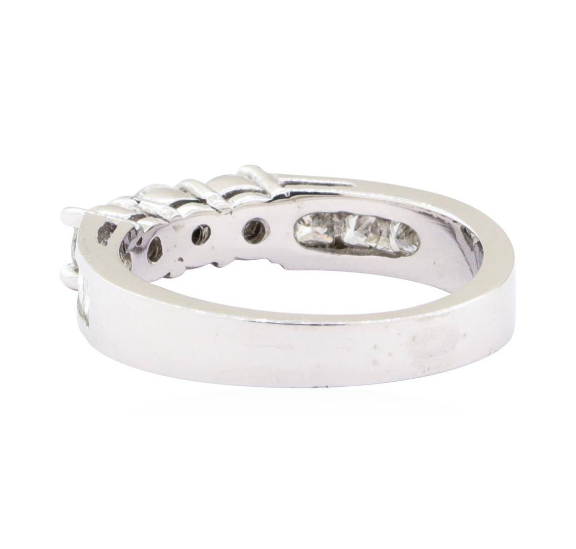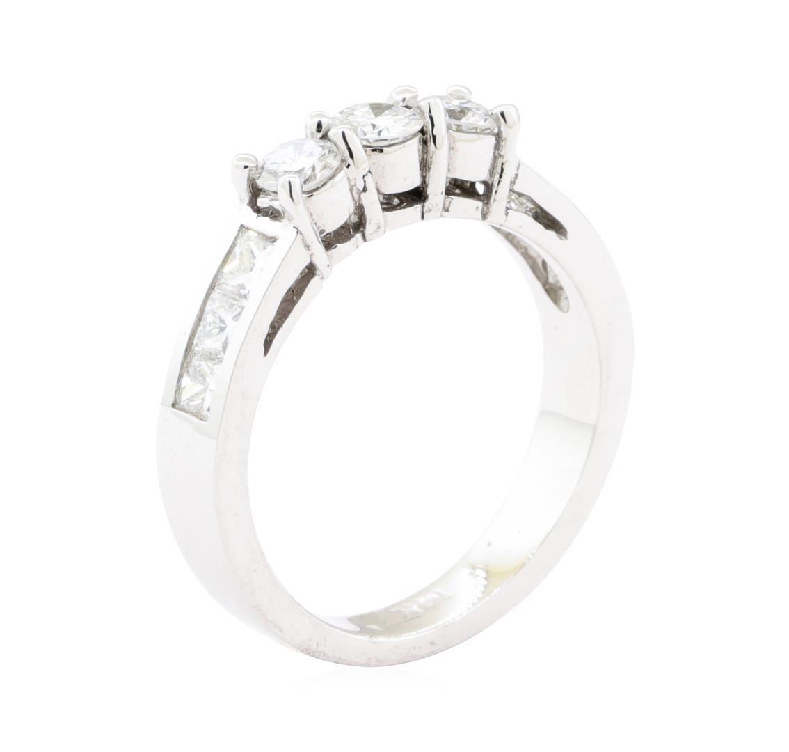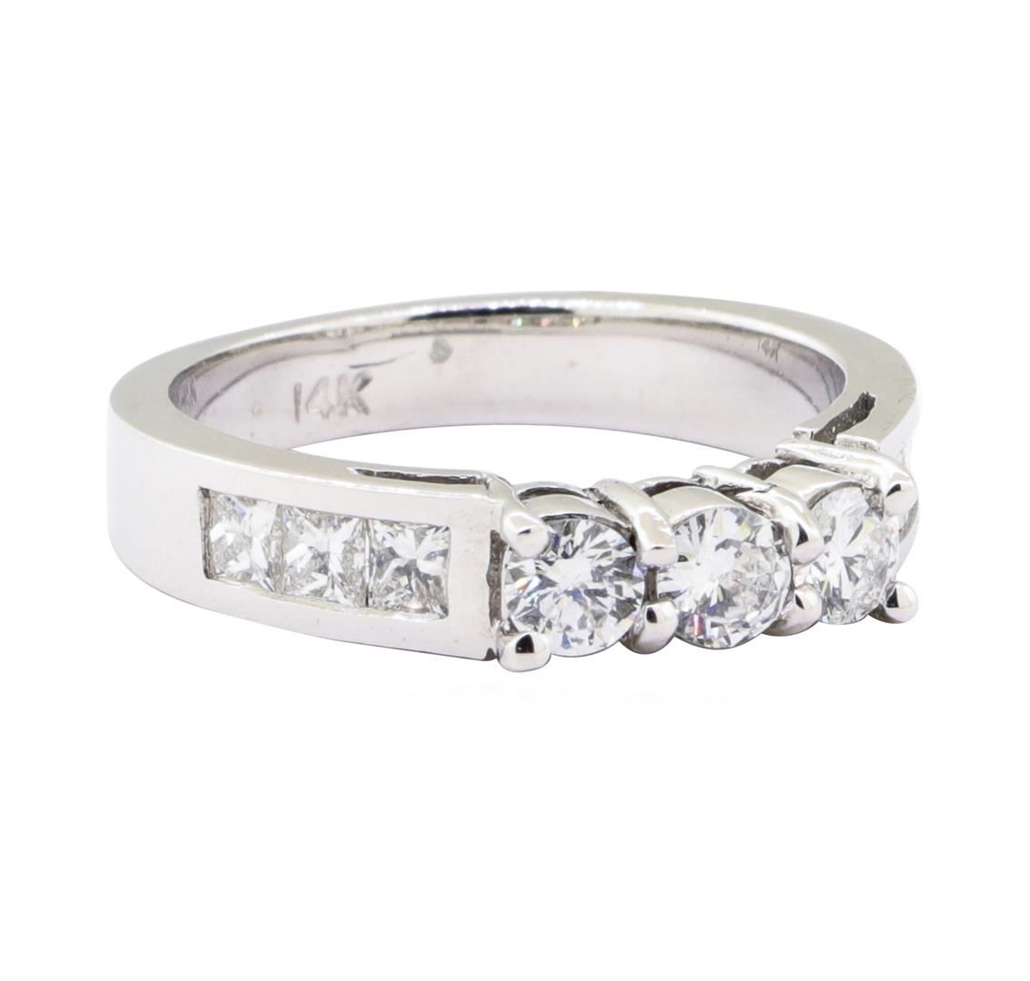 One ring with a straight line three stone motif featuring: 14KT white gold weighing 4.5 grams containing diamonds weighing 1.00ctw.