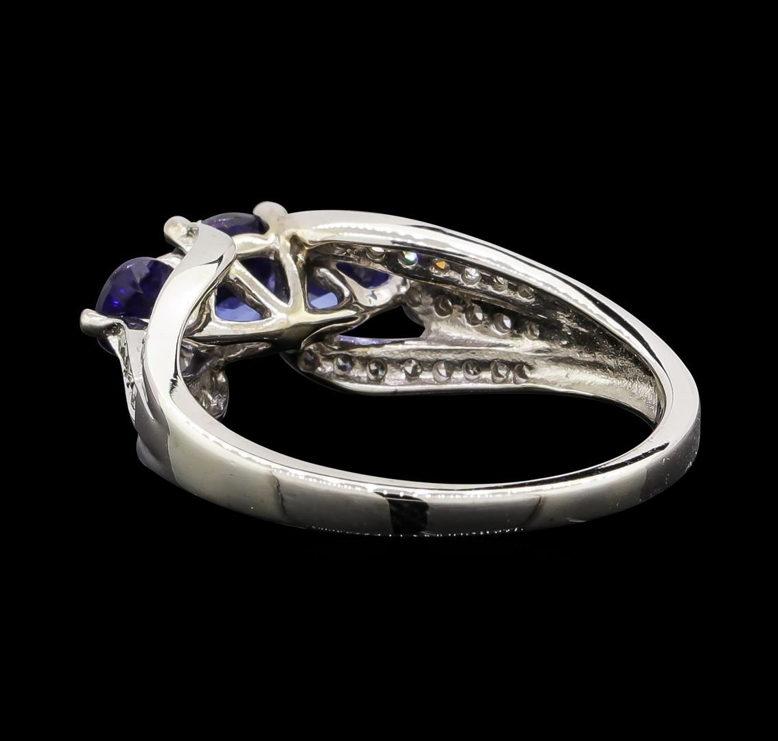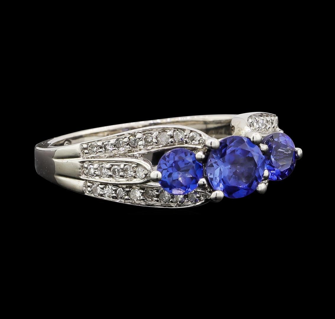 One ring: 10KT white gold weighing 2.80 grams containing three tanzanites weighing 1.00ctw and diamonds weighing 0.15ctw.