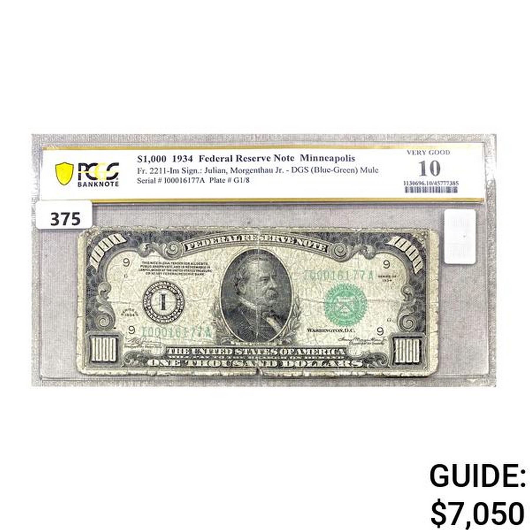 $1,000 Fed. Reserve Note Minneapolis PCGS VG10 Edge Damage