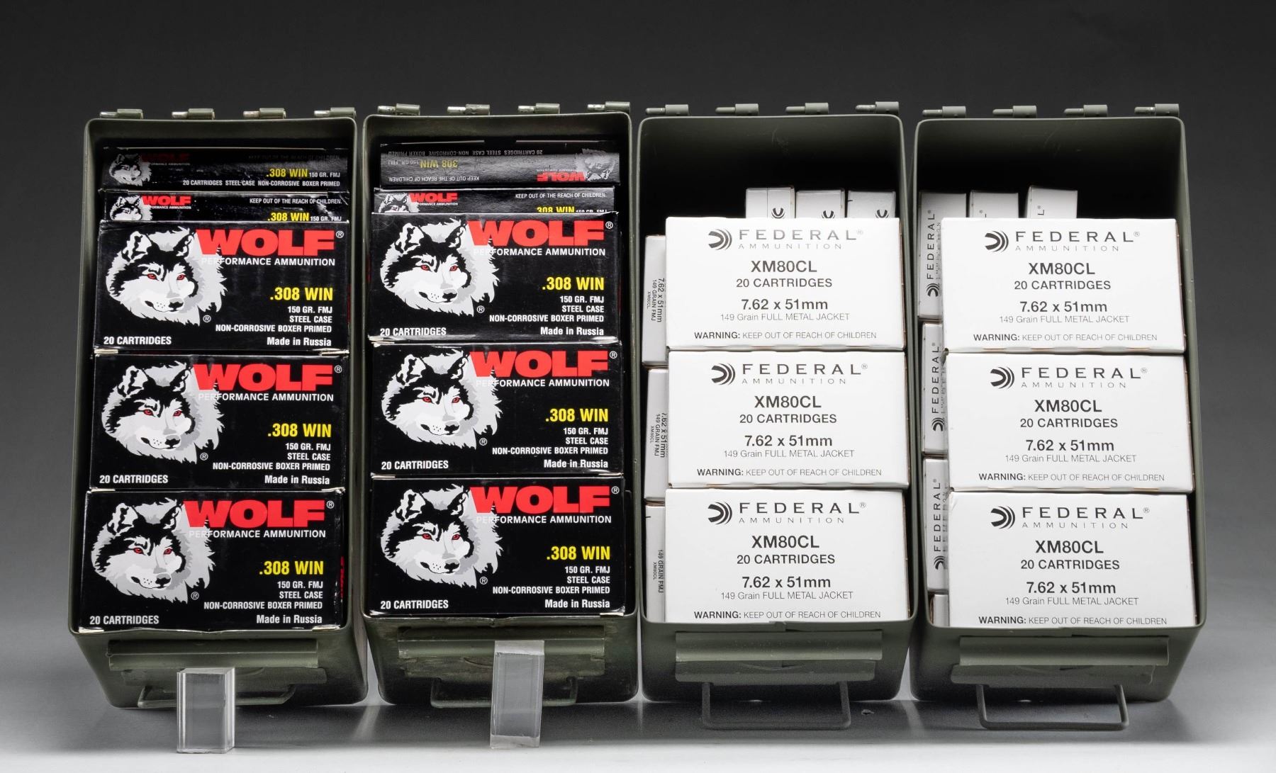 7.62X51 AMMO. All near excellent in 20 round boxes with FMJ bullets. Packed in 4 GI style 50 cal. cans. Wolf ammo made in Russia with steel cases, boxer primers, non-corrosive and 150 grain bullets. Federal ammo is 149 grain with stock number XM80CL. (02-25177-17/NW). $800-1,200.