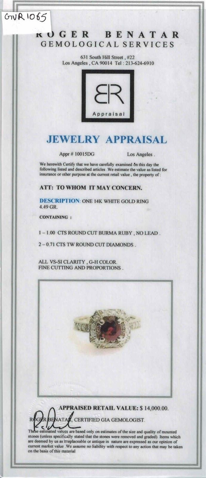 14K WHITE GOLD NATURAL RUBY RING:4.49 GRAMS/DIAMOND:0.71CT/RUBY:1.00CT/#GVR1065/ NO LEAD OR GLASS FILLING **Rubies are known to impart a feeling of power to the wearer, improving self confidence and adventurousness. This vivacious 1.00ct Round Cut Burma Ruby is like a delicate kiss, artfully set in 14K white gold. Encircled with a halo of twinkling 0.71ct Round Cut Diamonds, it adds a touch of subtle sparkle, with further detailing adorning the ring's stepped shank.**