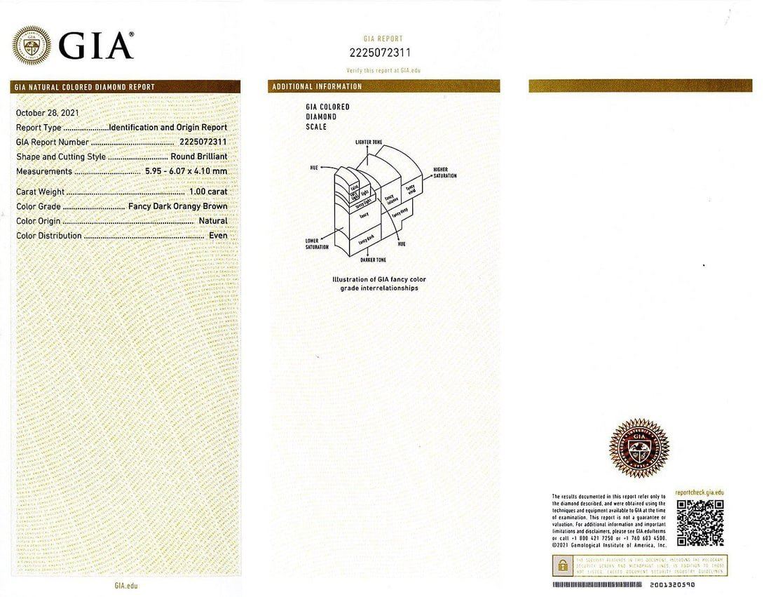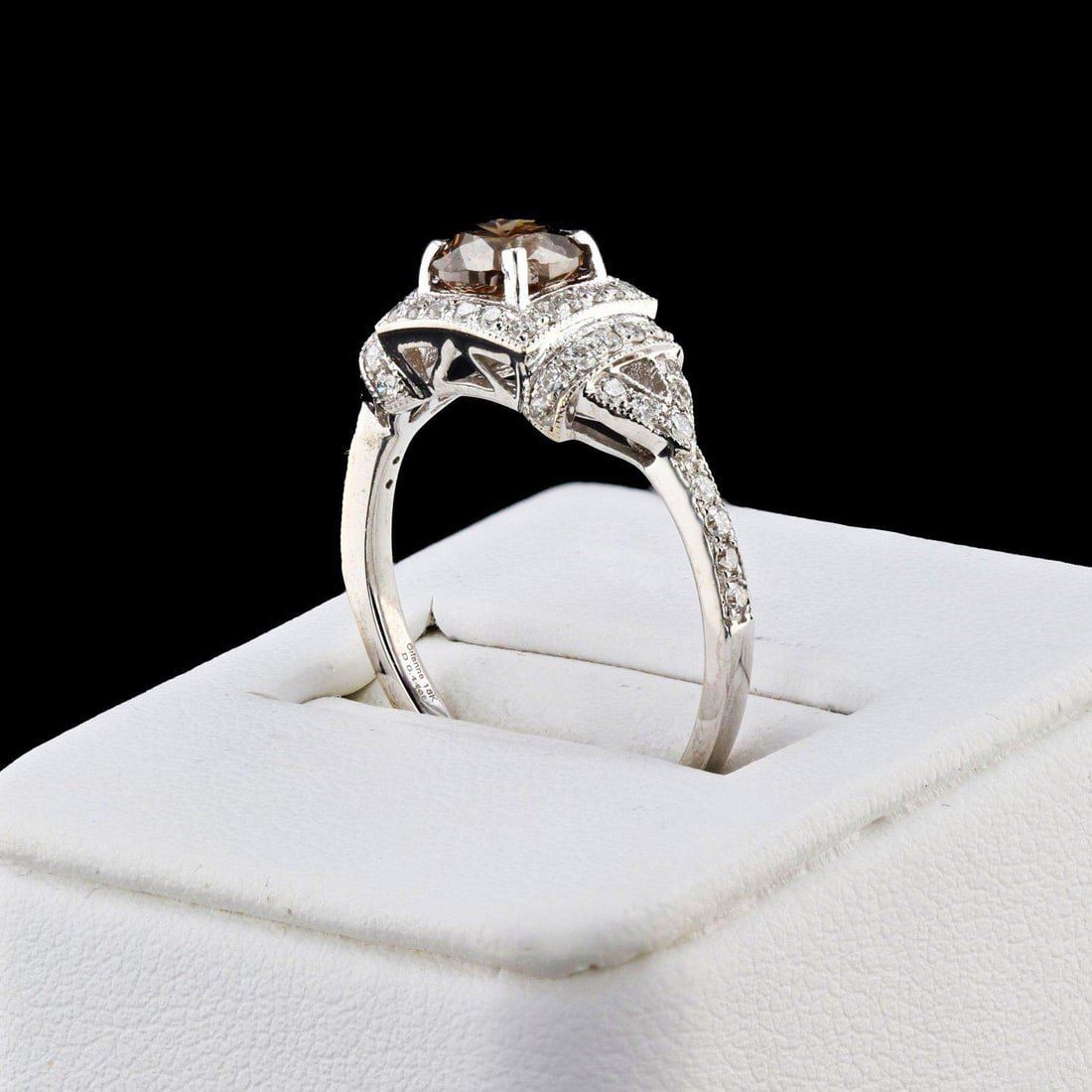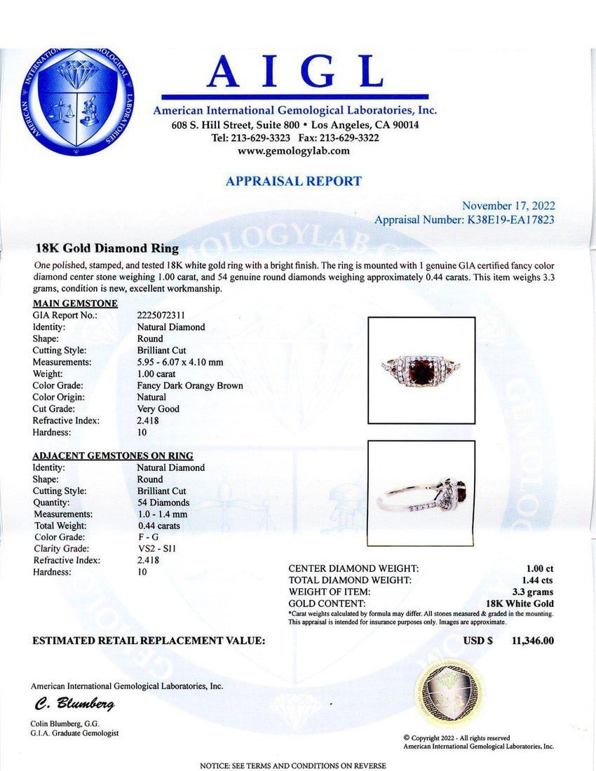 18K Gold Diamond Ring One polished, stamped, and tested 18K white gold ring with a bright finish. The ring is mounted with 1 genuine GIA certified fancy color diamond center stone weighing 1.00 carat, and 54genuine round diamonds weighing approximately 0.44 carats. This item weighs 3.3 grams, condition is new, excellent workmanship. *MAIN GEMSTONE* GIA Report No.: 2225072311 Identity: Natural Diamond Shape: RoundCutting Style: Brilliant Cut Measurements: 5.95 - 6.07 x 4.10mm Weight: 1.00 carat Color Grade: Fancy Dark Orangey Brown Color Origin: Natural Cut Grade: Very Good Refractive Index: 2.418 Hardness: 10*ADJACENT GEMSTONES ON RING* Identity: Natural Diamond Shape: Round Cutting Style: Brilliant Cut Quantity: 54 Diamonds Measurements: 1.0 - 1.4mm Total Weight: 0.44 carats Color Grade: F - G Clarity Grade: VS2- SI1 Refractive Index: 2.418 Hardness: 10
