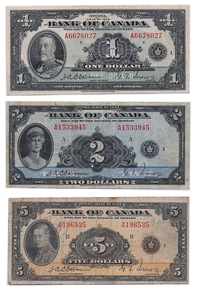 1935 Issue. BC-1. English Text. No. A6678027/C. Fine; $2.00. 1935 Issue. BC-3. English Text. No. A1533945/A. VG; $5.00. 1935 Issue. BC-5. English Text. No. A196535/B. Good+. Lot of three notes.