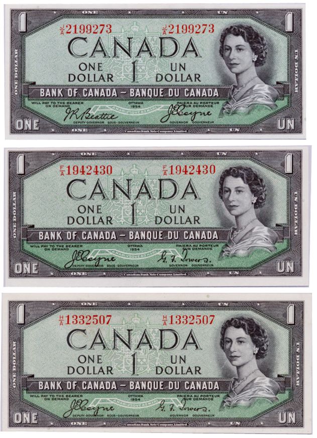 1954 Issue. BC-29a. Coyne-Towers. ‘Devil’s Face’. No. F/A1942430. BCS graded AU-58. No. H/A1332507. A ‘Changeover’ note. BCS graded AU-55; $1.00. 1954 Issue. BC-29b. Beattie-Coyne. ‘Devil’s Face’ No. J/A2199273. BCS graded AU-50. Lot of three (3) notes.