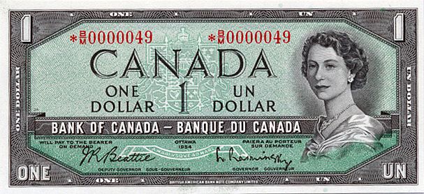 1954 Issue. BC-37bA-i. Beattie-Rasminsky. No. *B/M0000049. PMG graded AU-58EPQ. A low serial number replacement note.