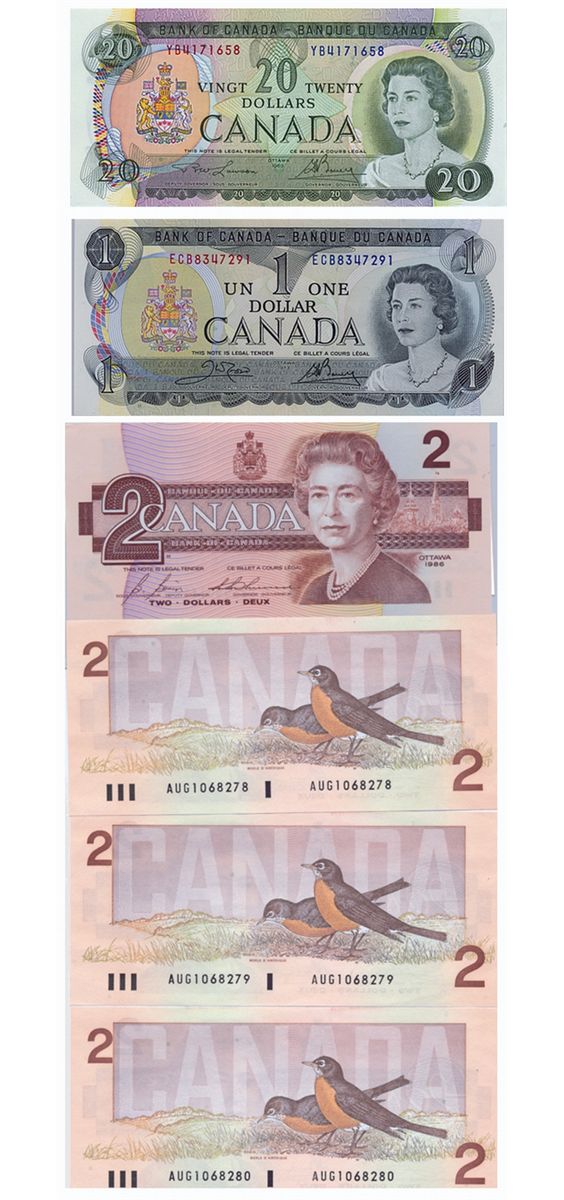 1973 Issue. BC-46b. Crow-Bouey. No. ECB8347291. BCS Gem Unc-67. $2.00. 1986 Issue. BC-55a. Crow-Bouey. No. AUG1068278, 8279, 8230. Three consec. UNC notes; $2.00. 1986 Issue. BC-55c. Bonin-Thiessen. No. CBI4401650. PMG graded Gem Unc-66. $20.00. 1969 Issue. BC-50b. Lawson-Bouey. No. YB4171658. CCCS graded Gem Unc-66. Lot of six (6) notes.