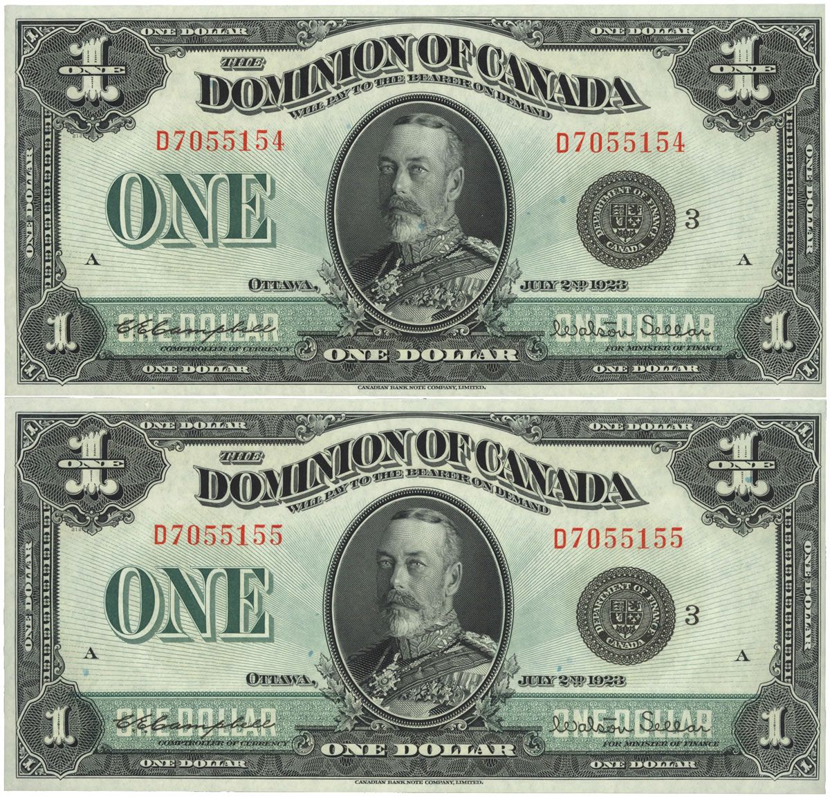 July 2, 1923. DC-25n. Campbell-Sellar. Black seal, Group 3. Set of two (2) consecutive serial numbered notes. No. D7055154/A, PMG graded Choice Unc-63 EPQ. No. D7055155/A, PMG graded Choice Unc-64 EPQ. Lot of two (2) notes.
