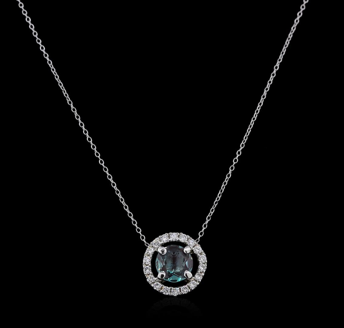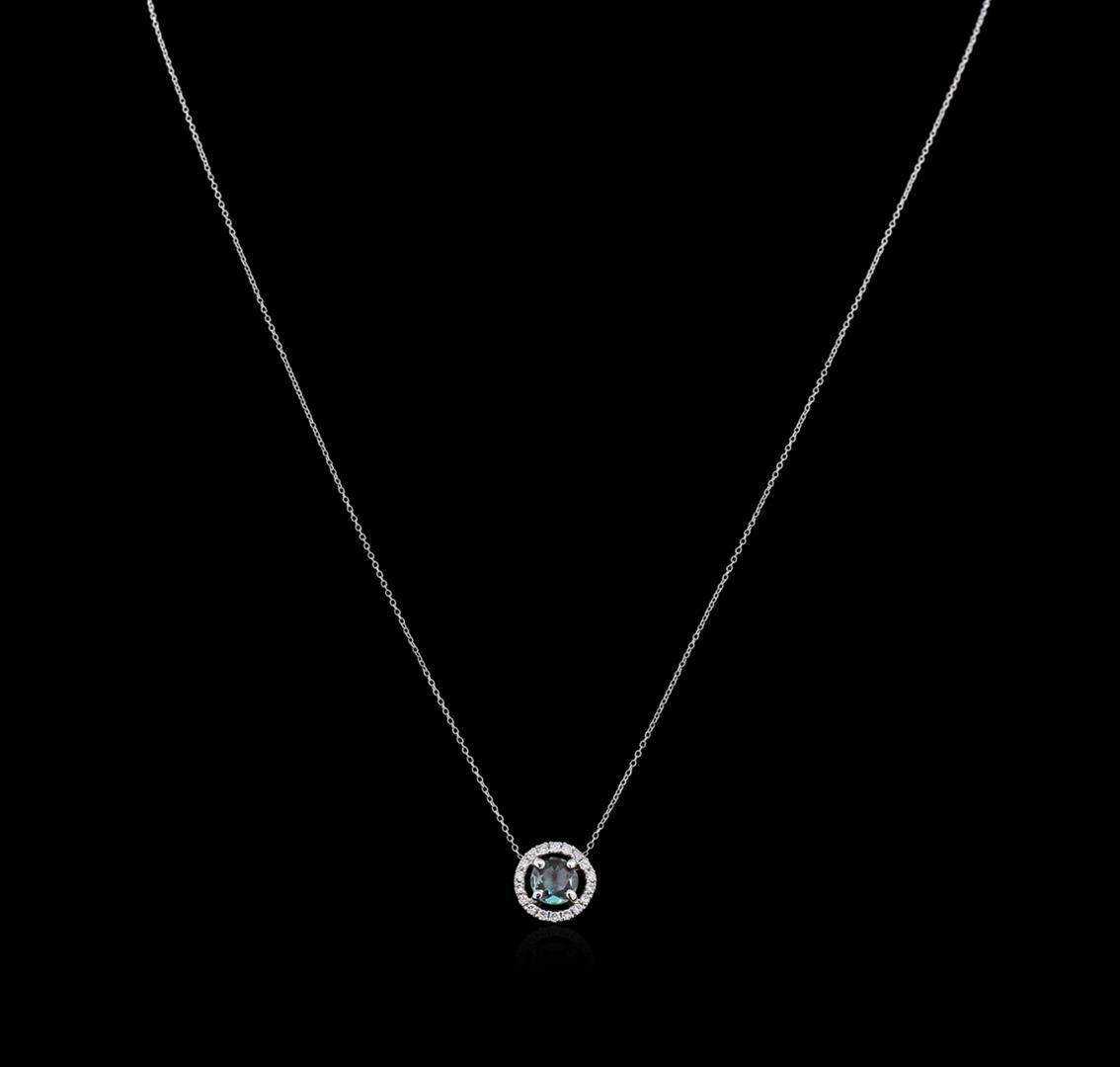 One pendant with chain featuring: 14KT white gold weighing 1.80 grams containing one prong set round cut alexandrite center stone with a total weight of 1.00ct and pave set round diamonds with a total weight of 0.10ct.
