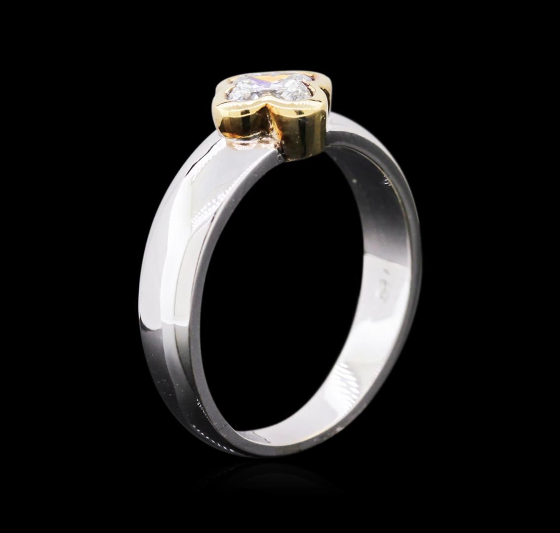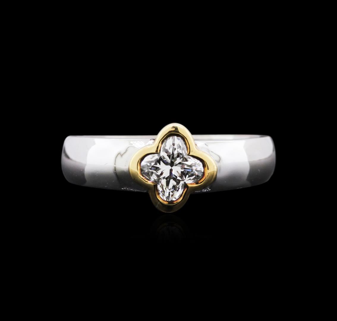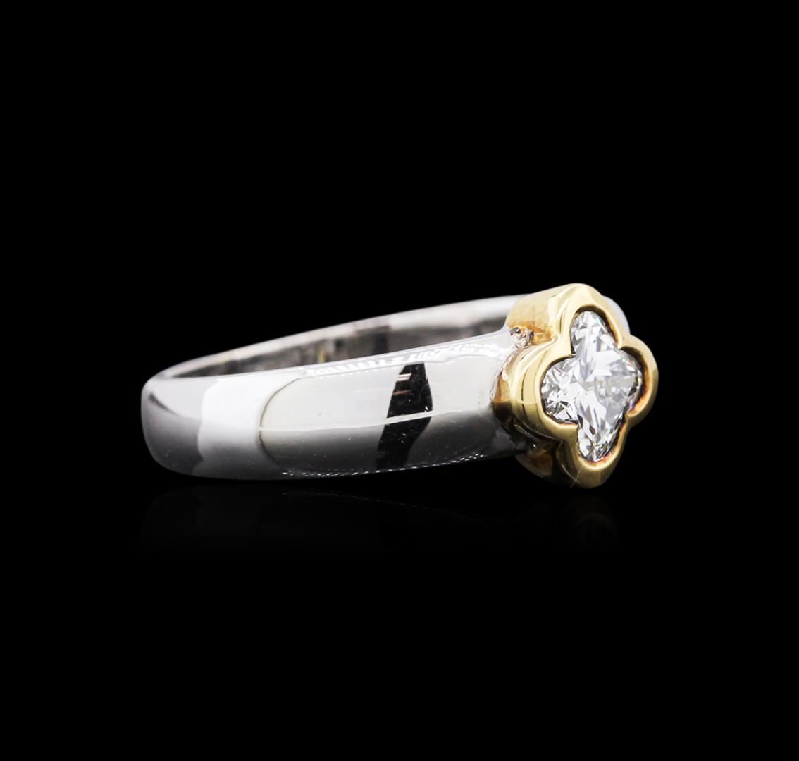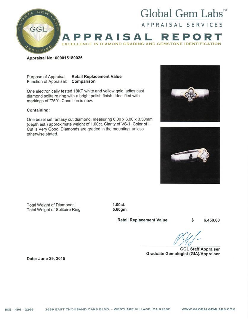 One electronically tested 18KT white and yellow gold ladies cast diamond solitaire ring with a bright polish finish. Identified with markings of "750". Condition is new. Containing: One bezel set fantasy cut diamond, measuring 6.00 x 6.00 x 3.50mm (depth est.) approximate weight of 1.00ct. Clarity: VS-1. Color: I, Cut is Very Good. Diamonds are graded in the mounting, unless otherwise stated. Total Weight of Diamonds 1.00ct. Total Weight of Solitaire Ring 5.60 grams. GGL Appraised at $6,450.00.