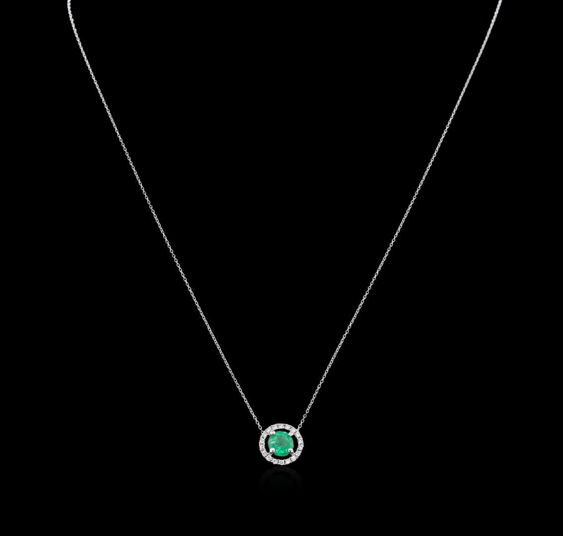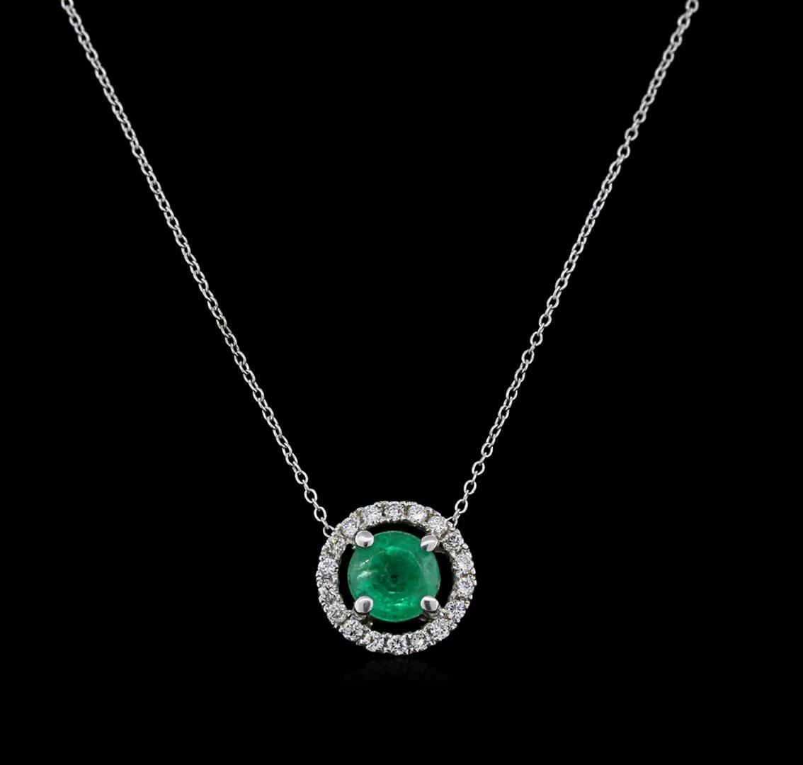 One pendant with chain featuring: 14KT white gold weighing 1.90 grams containing one prong set round cut emerald center stone with a total weight of 1.00ct and pave set round diamonds with a total weight of 0.10ct.