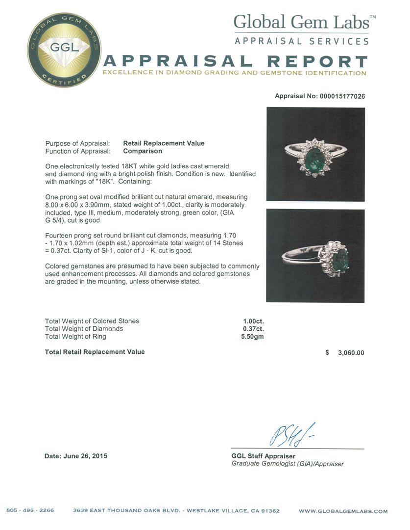 One electronically tested 18KT white gold ladies cast emerald and diamond ring with a bright polish finish. Identified with markings of "18K". Condition is new. Containing: One prong set oval modified brilliant cut natural emerald, measuring 8.00 x 6.00 x 3.90mm, stated weight of 1.00ct., clarity is moderately included, type III, medium, moderately strong, green color, (GIA G 5/4), cut is good. Fourteen prong set round brilliant cut diamonds, measuring 1.70 - 1.70 x 1.02mm (depth est.) approximate total weight of 14 Stones = 0.37ct. Clarity: SI-1. Color: J - K, Cut is Good. Colored gemstones are presumed to have been subjected to commonly used enhancement processes. All diamonds and colored gemstones are graded in the mounting, unless otherwise stated. Total Weight of Colored Stones 1.00ct. Total Weight of Diamonds 0.37ct. Total Weight of Ring 5.50 grams. GGL Appraised at $3,060.00.