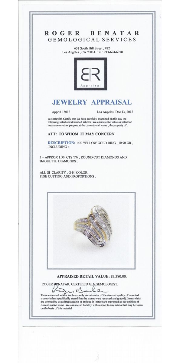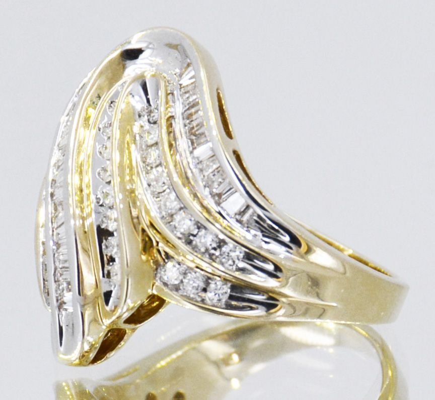 10kt Yellow Gold 4.30 Approx grams including, 1.00cttw Round and Baguette Diamond H-I color SI-I clarity, size 7.25, Appraised Retail Value $1580.00