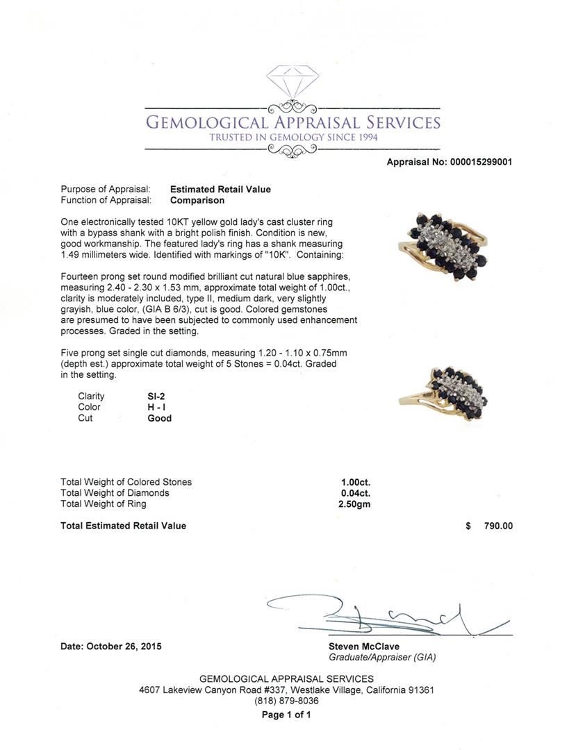 One electronically tested 10KT yellow gold lady's cast cluster ring with a bypass shank with a bright polish finish. The featured lady's ring has a shank measuring 1.49 millimeters wide. Identified with markings of "10K". Condition is new, good workmanship. Containing: Fourteen prong set round modified brilliant cut natural blue sapphires, measuring 2.40 - 2.30 x 1.53 mm, approximate total weight of 1.00ct., clarity is moderately included, type II, medium dark, very slightly grayish, blue color, (GIA B 6/3), cut is good. Colored gemstones are presumed to have been subjected to commonly used enhancement processes. Graded in the setting. Five prong set single cut diamonds, measuring 1.20 - 1.10 x 0.75mm (depth est.) approximate total weight of 5 Stones = 0.04ct. Graded in the setting. Clarity: SI-2. Color: H - I. Cut Good. Total Weight of Colored Stones 1.00ct. Total Weight of Diamonds 0.04ct. Total Weight of Ring 2.50gm. GAS Appraised at $790.00.
