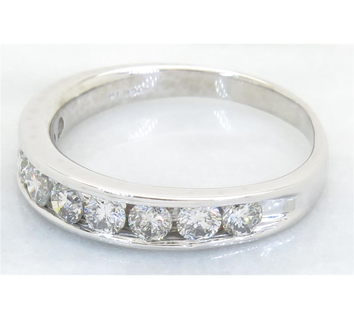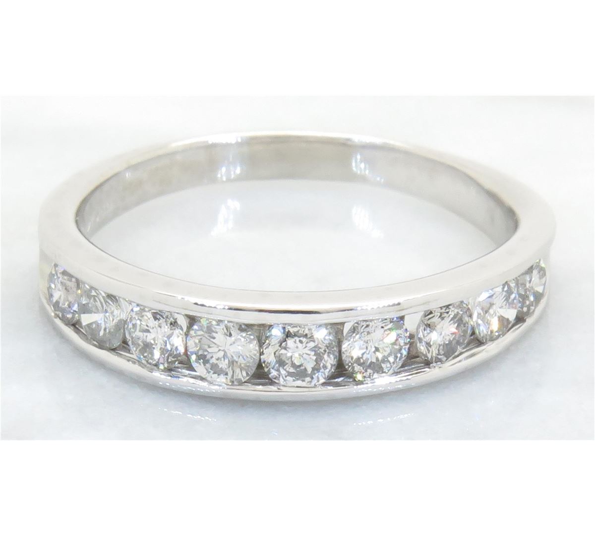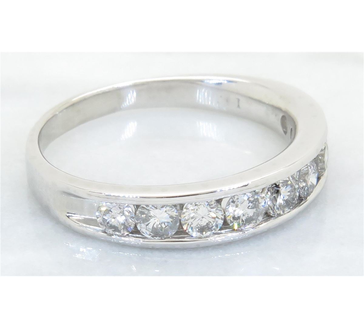 One tested platinum diamond ring. Containing: Nine Round Brilliant Cut Diamonds. Clarity: I, Color: G-H. Approximate total diamond weight: 1.00CTW. All diamonds are graded in the mounting unless otherwise stated. Weight of ring: 6.0 grams, Size: 8.0.