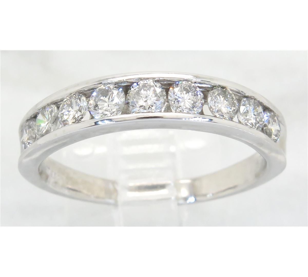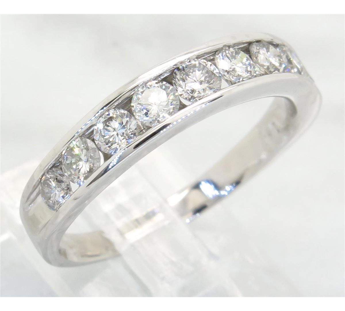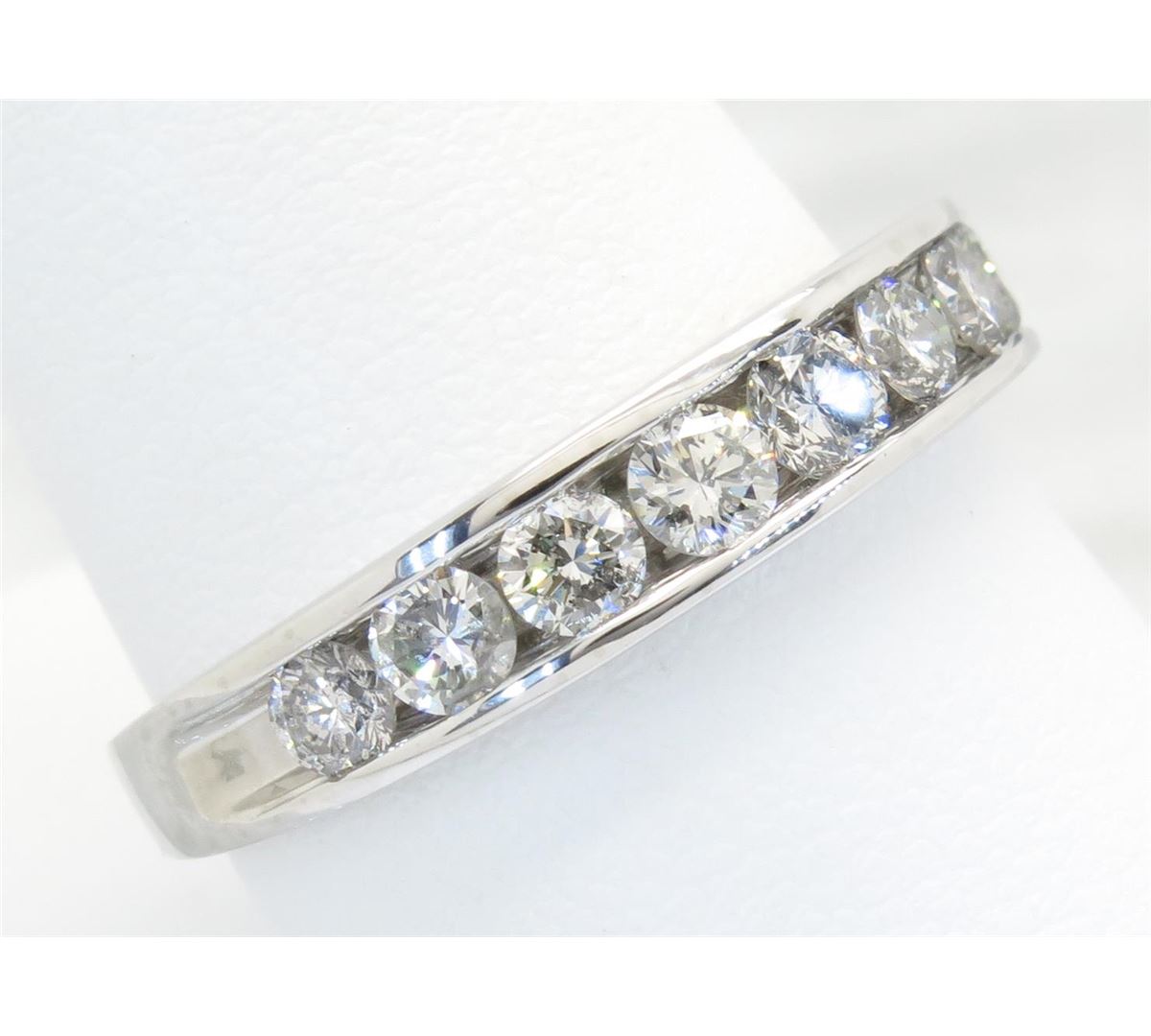One tested platinum diamond ring. Containing: Nine Round Brilliant Cut Diamonds. Clarity: I, Color: G-H. Approximate total diamond weight: 1.00CTW. All diamonds are graded in the mounting unless otherwise stated. Weight of ring: 6.0 grams, Size: 8.0.