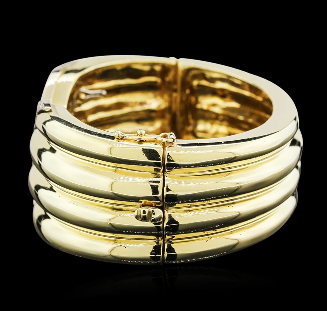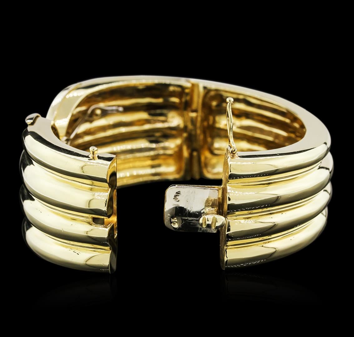 One electronically tested 14KT yellow and white gold lady's combination cast & assembled fashion bangle bracelet with a tongue clasp with foldover safety with a bright polish finish. The featured lady's bracelet has a detachable white gold insignia and an internal circumference of approximately 6.5 inches. Identified with markings of "14K". Condition is new, good workmanship. Containing: Twenty-Four bead set round brilliant cut diamonds, measuring 2.20 - 2.00 x 1.37mm (depth est.) approximate total weight of 24 Stones = 0.90ct. Graded in the setting. Clarity: VS-2 to SI-1. Color: H - I. Cut Good Eight bead set round brilliant cut diamonds, measuring 1.60 - 1.40 x 0.98mm (depth est.) approximate total weight of 8 Stones = 0.10ct. Graded in the setting. Clarity: VS-2 to SI-1. Color: G - Good. Total Weight of Diamonds 1.00ct. Total Weight of Bangle Bracelet 94.10gm. GAS Appraised at $10,745.00.