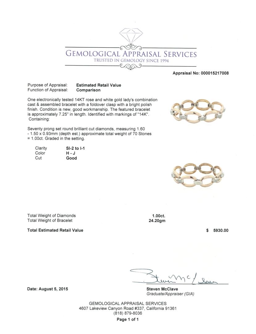 One electronically tested 14KT rose and white gold lady's combination cast & assembled bracelet with a foldover clasp with a bright polish finish. The featured bracelet is approximately 7.25" in length. Identified with markings of "14K". Condition is new, good workmanship. Containing: Seventy prong set round brilliant cut diamonds, measuring 1.60 - 1.50 x 0.93mm (depth est.) approximate. Total Weight of 70 Stones = 1.00ct. Graded in the setting. Clarity: SI-2 to I-1. Color: H - Good. Total Weight of Diamonds 1.00ct. Total Weight of Bracelet 24.20gm. GAS Appraised at $5,930.00.