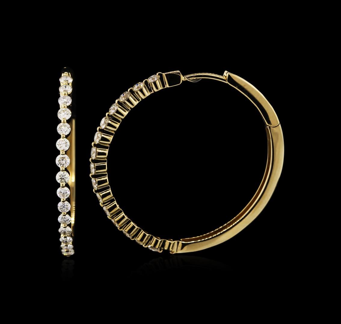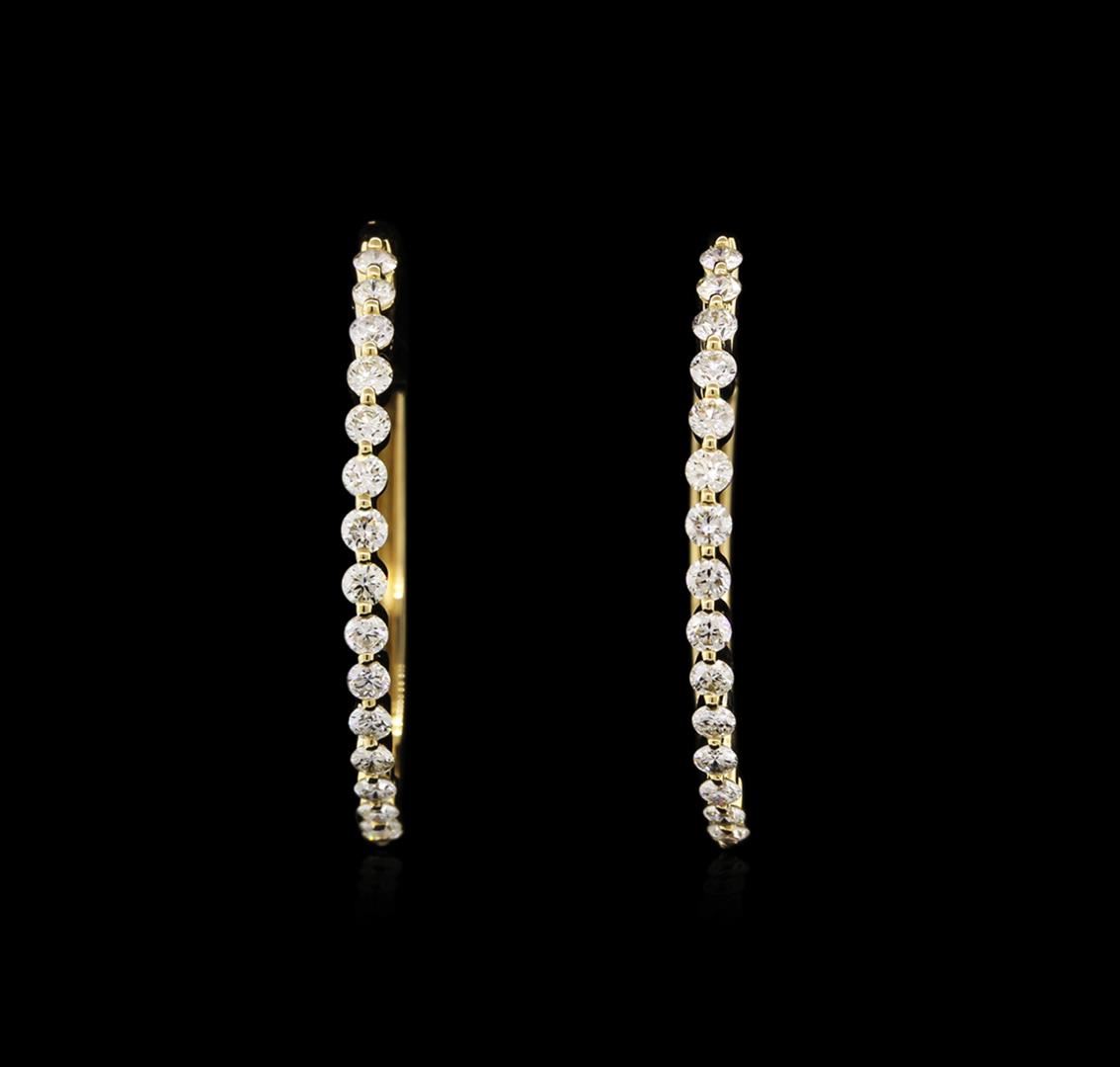 One pair of hoop earrings featuring: 14KT yellow gold weighing 2.90 grams containing 32 brilliant cut diamonds with a total weight of 1.00ct.