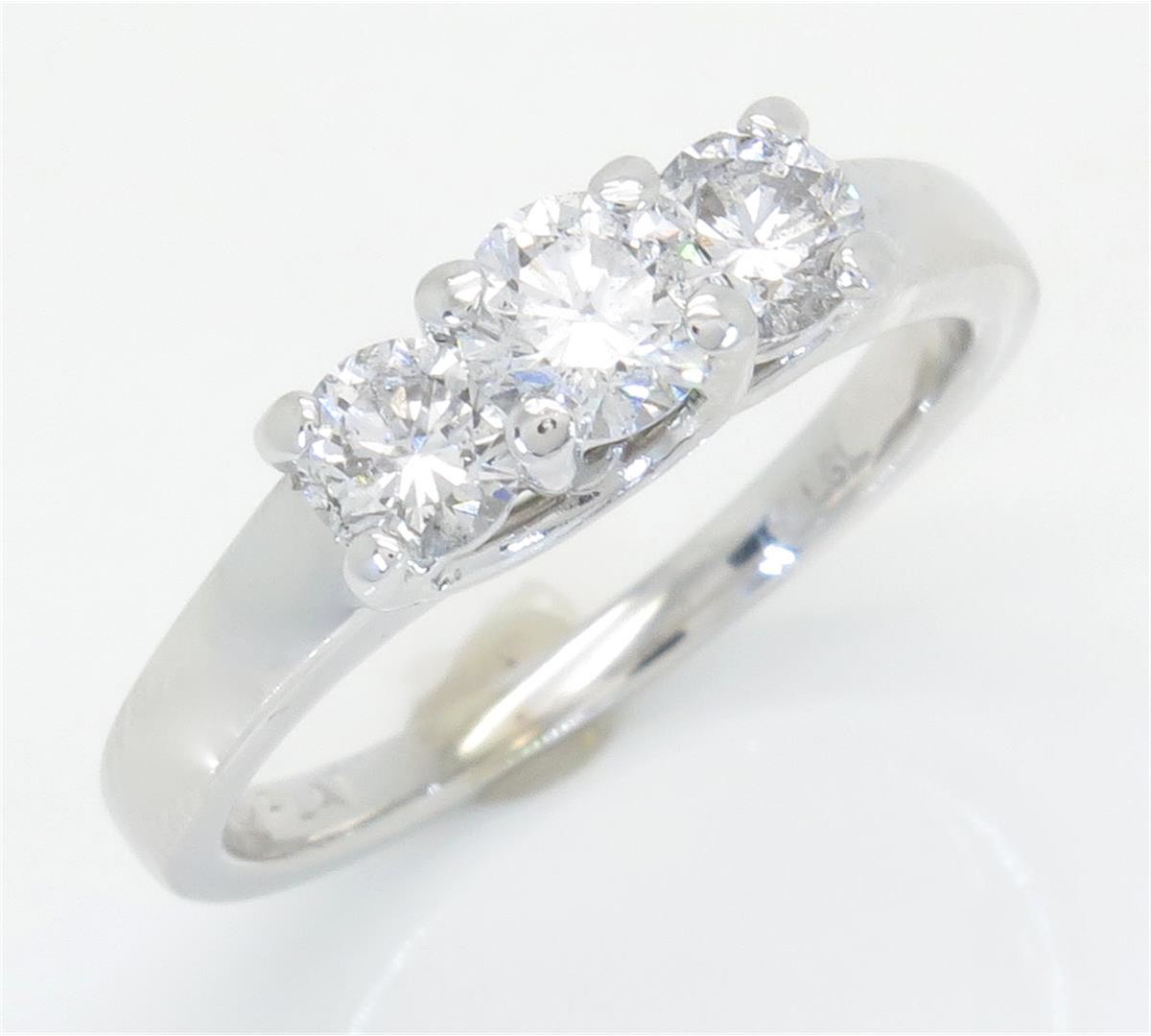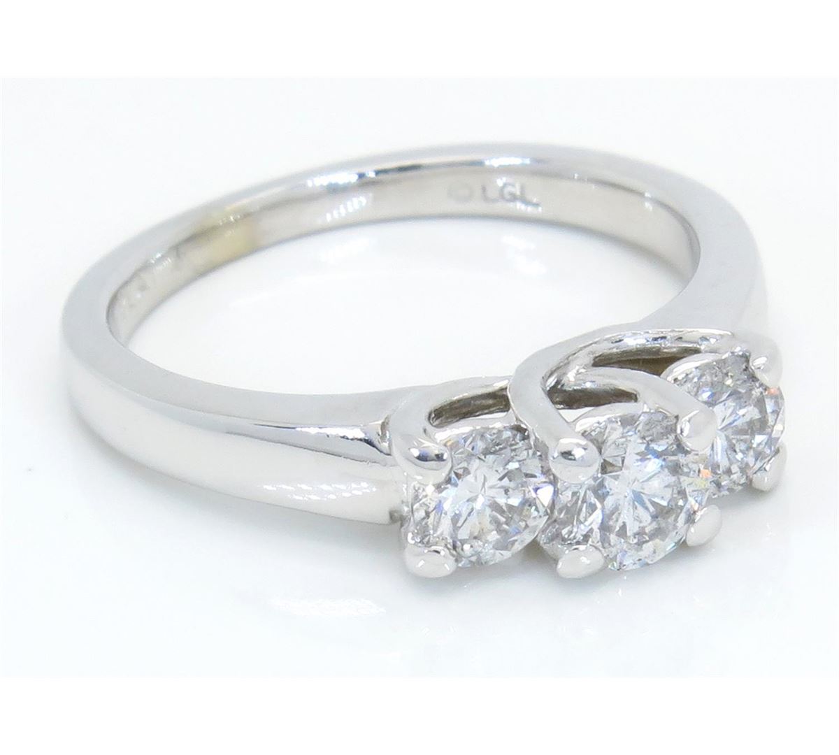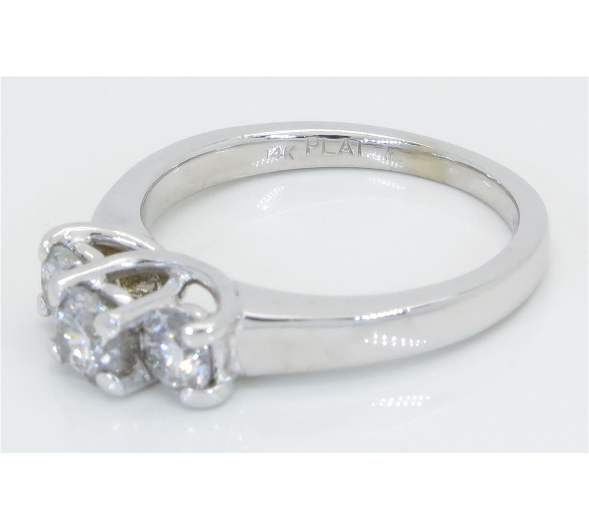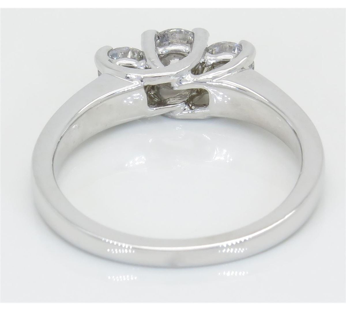 One tested 14K white gold diamond ring. Containing: Three Round Brilliant Cut Diamonds. Size of center diamond: .43CT. Clarity: I, Color: F-G. Approximate Total diamond weight: 1.00CTW. Diamonds are graded in the mounting, unless otherwise stated. Weight