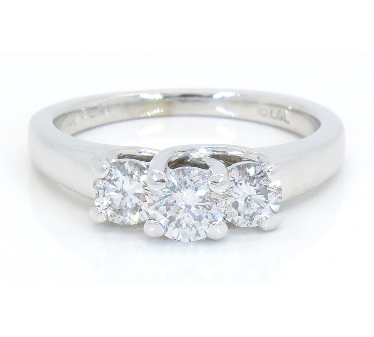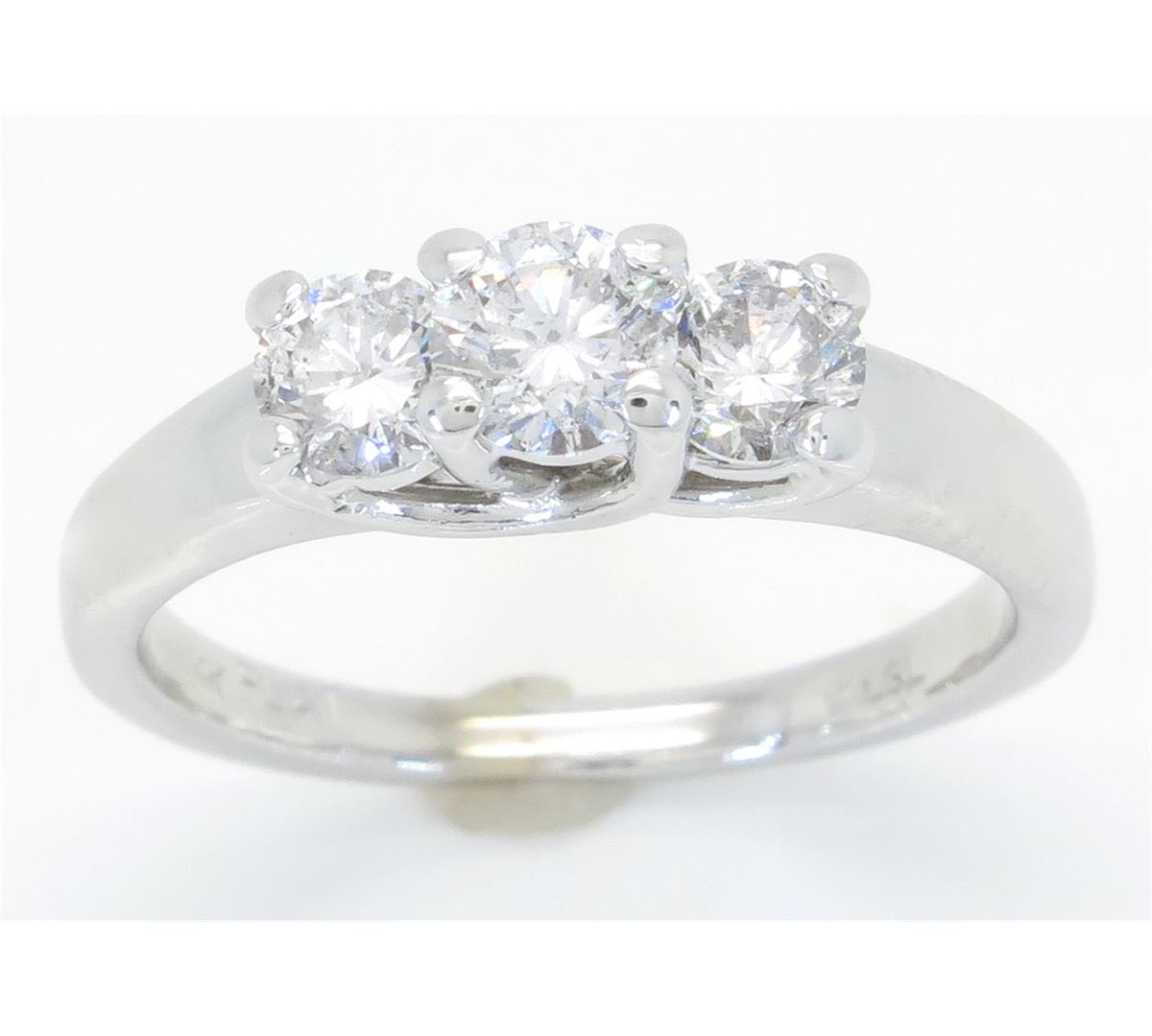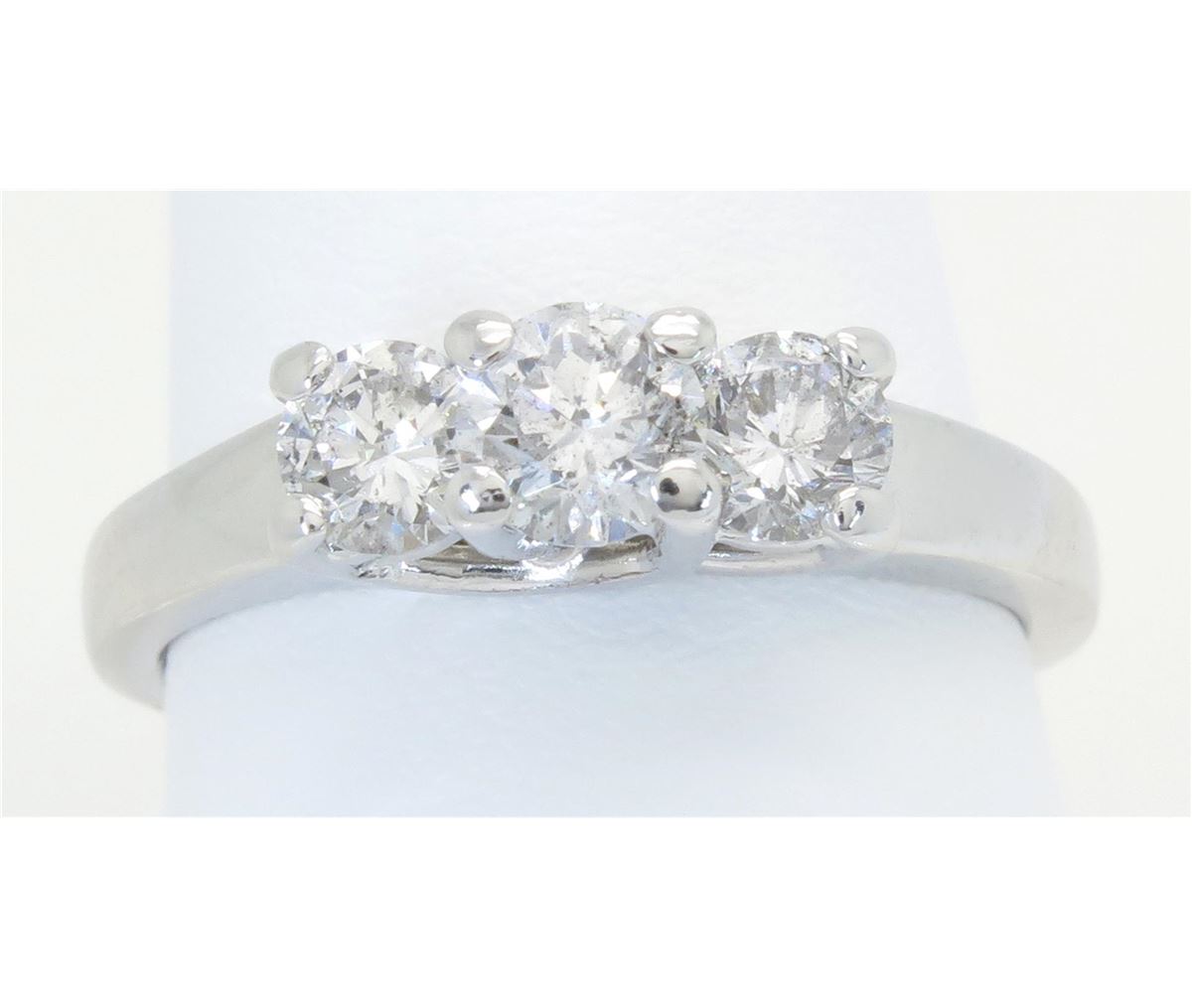 One tested 14K white gold diamond ring. Containing: Three Round Brilliant Cut Diamonds. Size of center diamond: .43CT. Clarity: I, Color: F-G. Approximate Total diamond weight: 1.00CTW. Diamonds are graded in the mounting, unless otherwise stated. Weight of ring: 4.92 grams. Size: 7.0.