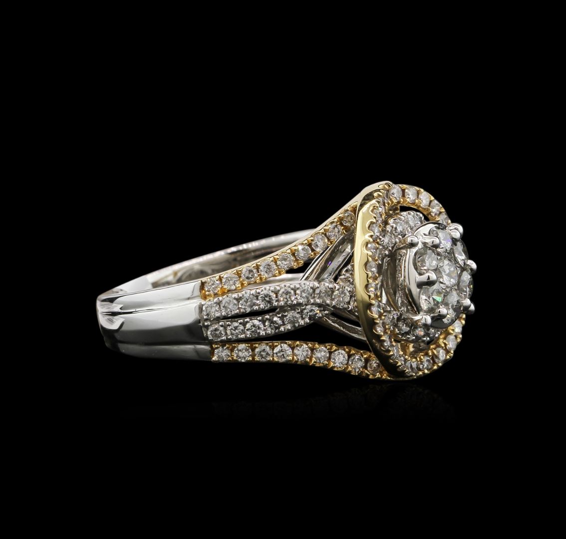 One electronically tested 14KT white and yellow gold lady's combination cast & assembled fashion ring with a split shank with a bright polish finish. The featured lady's ring has a double halo motif with a 3.0 millimeter wide shank Identified with markings of "14K". Condition is new, good workmanship. Containing: One invisible set round brilliant cut diamond, measuring 2.90 - 2.85 x 1.87mm (depth est.) approximate weight of 0.10ct. Graded in the setting. Clarity: SI-2. Color: Good Six illusion set round brilliant cut diamonds, measuring 2.40 - 2.30 x 1.41mm (depth est.) approximate. Total Weight of 6 Stones = 0.29ct. Graded in the setting. Clarity: SI-2 to I-1. Color: H - I. Cut Good One Hundred Fourteen prong set round brilliant cut diamonds, measuring 1.20 - 1.10 x 0.69mm (depth est.) approximate. Total Weight of 114 Stones = 0.61ct. Graded in the setting. Clarity: SI-1 to I-1. Color: H - I. Cut Good. Total Weight of Diamonds 1.00ct. Total Weight of Ring 5.60gm. GAS Appraised at $4,850.00.