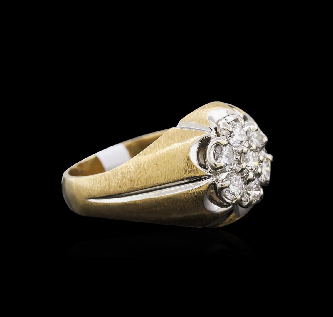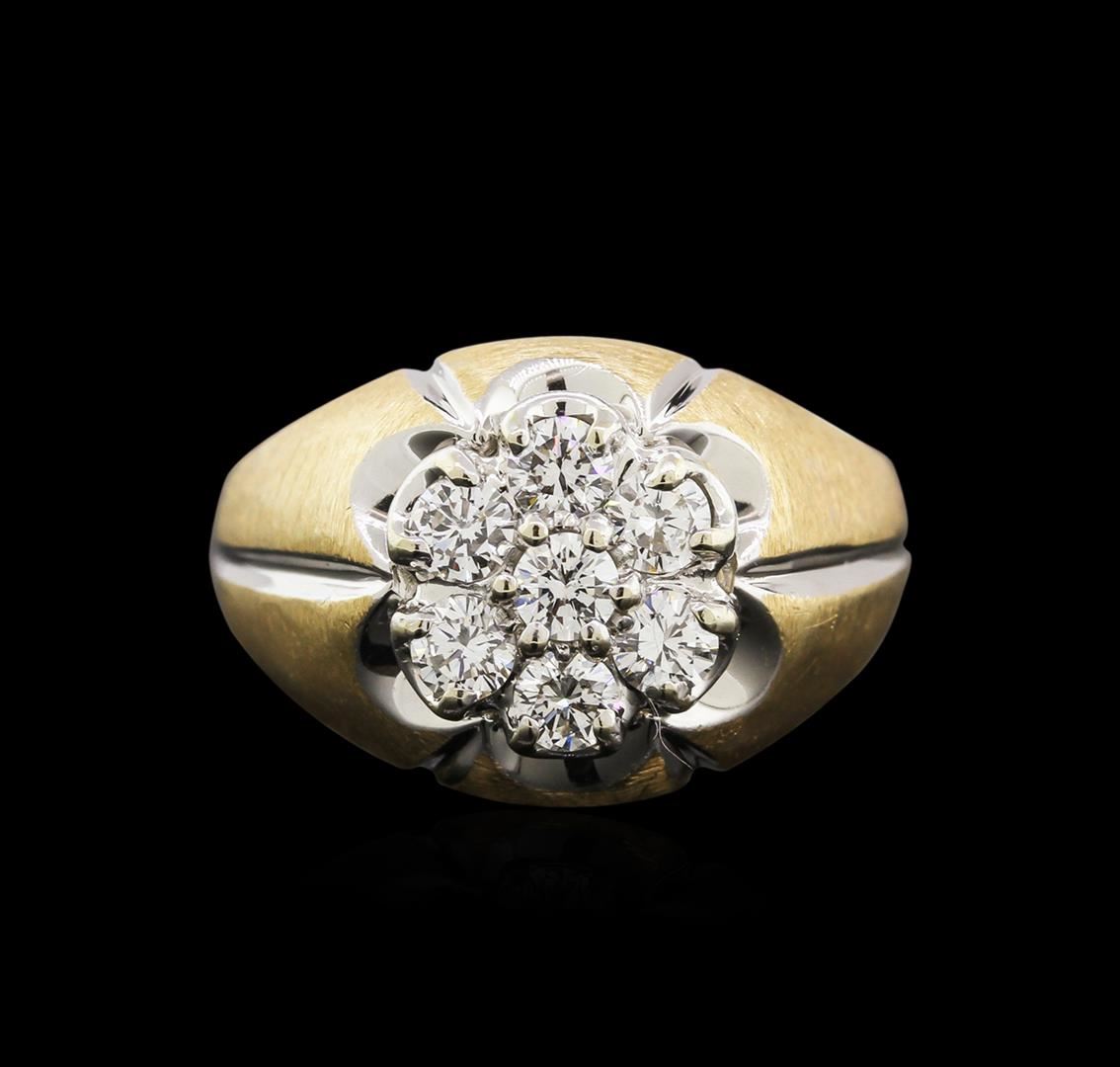 One electronically tested 14KT yellow and white gold man's combination cast & assembled fashion ring with a tapered shank with a brushed finish. Condition is new. Identified with markings of "14K". Containing: Seven prong set round brilliant cut diamonds, measuring 3.40 - 3.35 x 2.03mm (depth est.) approximate total weight of 7 Stones = 1.00ct. Graded in the setting. Clarity: VS-2 to SI-1. Color: I - J. Cut: Good. Total Weight of Diamonds: 1.00ct. Total Weight of Ring: 10.00 gm. GAS Appraised at $6,730.00.