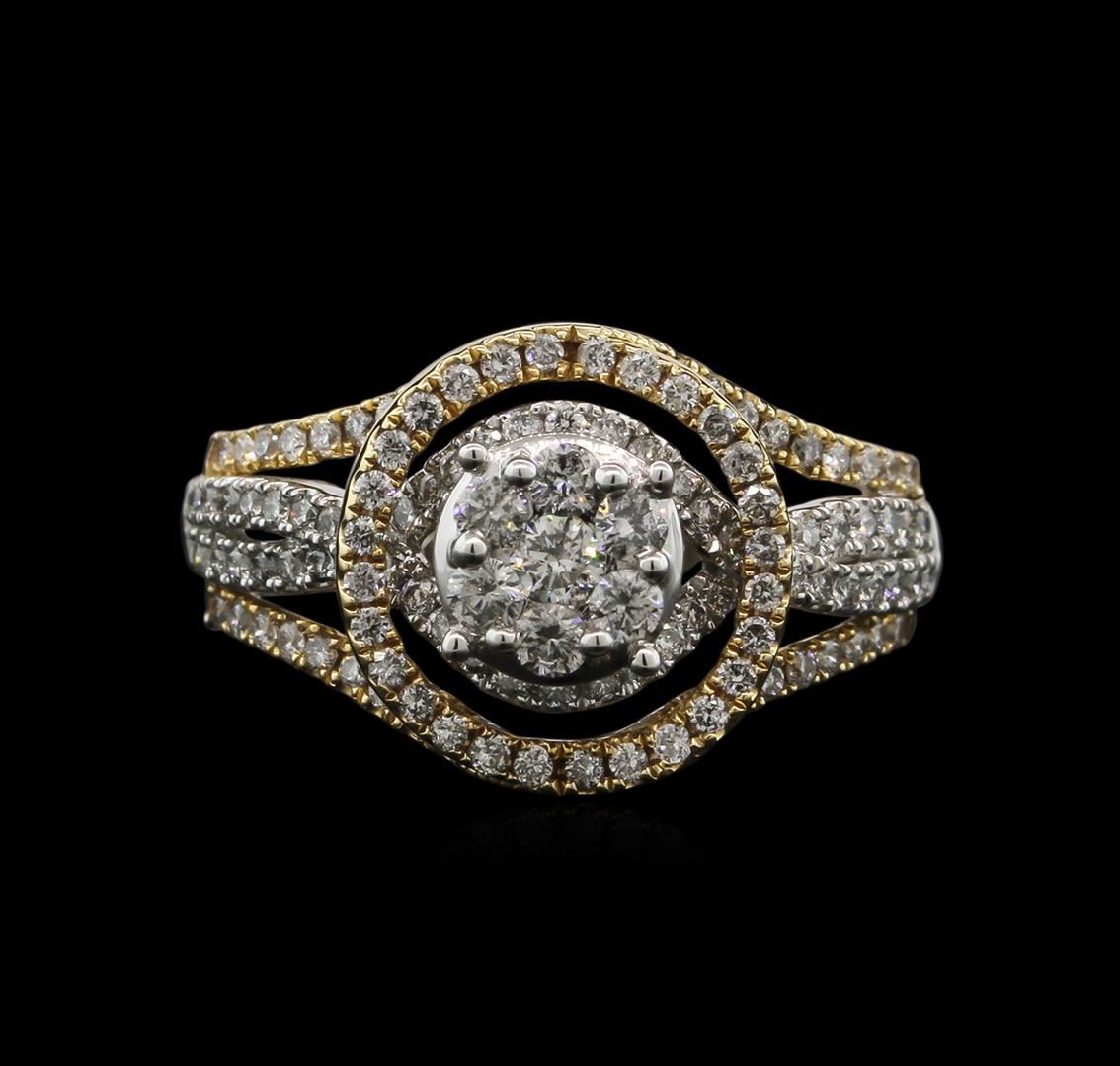 One electronically tested 14KT white and yellow gold lady's combination cast & assembled fashion ring with a split shank with a bright polish finish. The featured lady's ring has a double halo motif with a 3.0 millimeter wide shank Identified with markings of "14K". Condition is new, good workmanship. Containing: One invisible set round brilliant cut diamond, measuring 2.90 - 2.85 x 1.87mm (depth est.) approximate weight of 0.10ct. Graded in the setting. Clarity: SI-2. Color: Good Six illusion set round brilliant cut diamonds, measuring 2.40 - 2.30 x 1.41mm (depth est.) approximate. Total Weight of 6 Stones = 0.29ct. Graded in the setting. Clarity: SI-2 to I-1. Color: H - I. Cut Good One Hundred Fourteen prong set round brilliant cut diamonds, measuring 1.20 - 1.10 x 0.69mm (depth est.) approximate. Total Weight of 114 Stones = 0.61ct. Graded in the setting. Clarity: SI-1 to I-1. Color: H - I. Cut Good. Total Weight of Diamonds 1.00ct. Total Weight of Ring 5.60gm. GAS Appraised at $4,850.00.