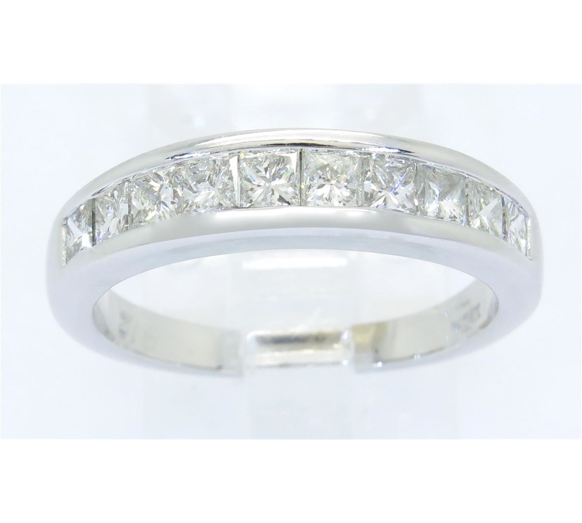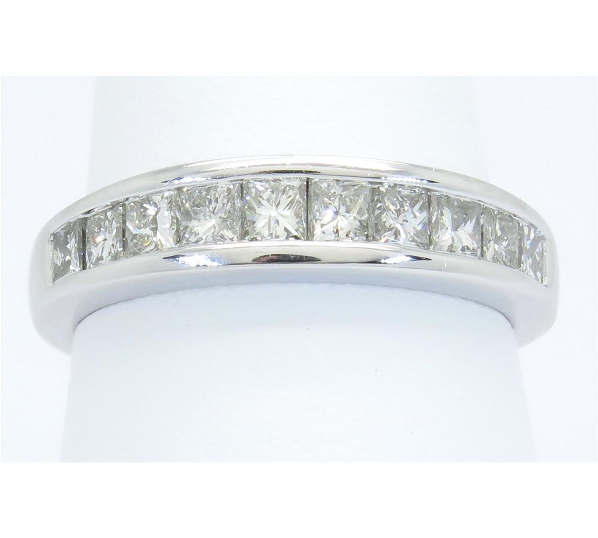 One tested 14K white gold diamond band. Containing:10 Princess Cut Diamonds, Clarity: I, Color: G-H. Approximate total diamond weight: 1CTW. All diamonds are graded in the mounting unless otherwise stated. Weight of ring: 4.1 grams, Size: 7.0.