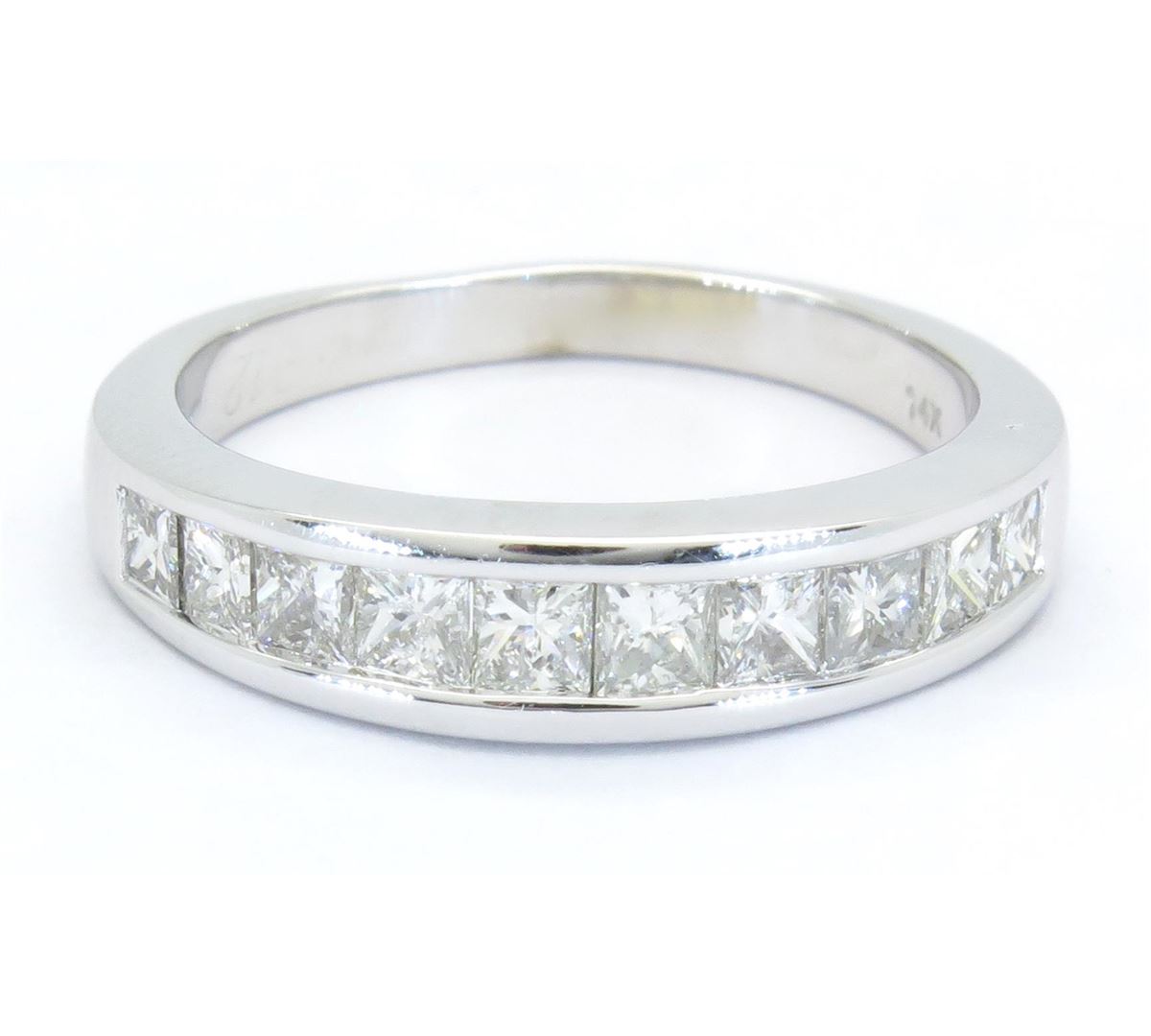 One tested 14K white gold diamond band. Containing:10 Princess Cut Diamonds, Clarity: I, Color: G-H. Approximate total diamond weight: 1CTW. All diamonds are graded in the mounting unless otherwise stated. Weight of ring: 4.1 grams, Size: 7.0.