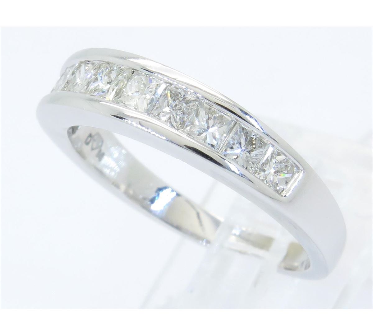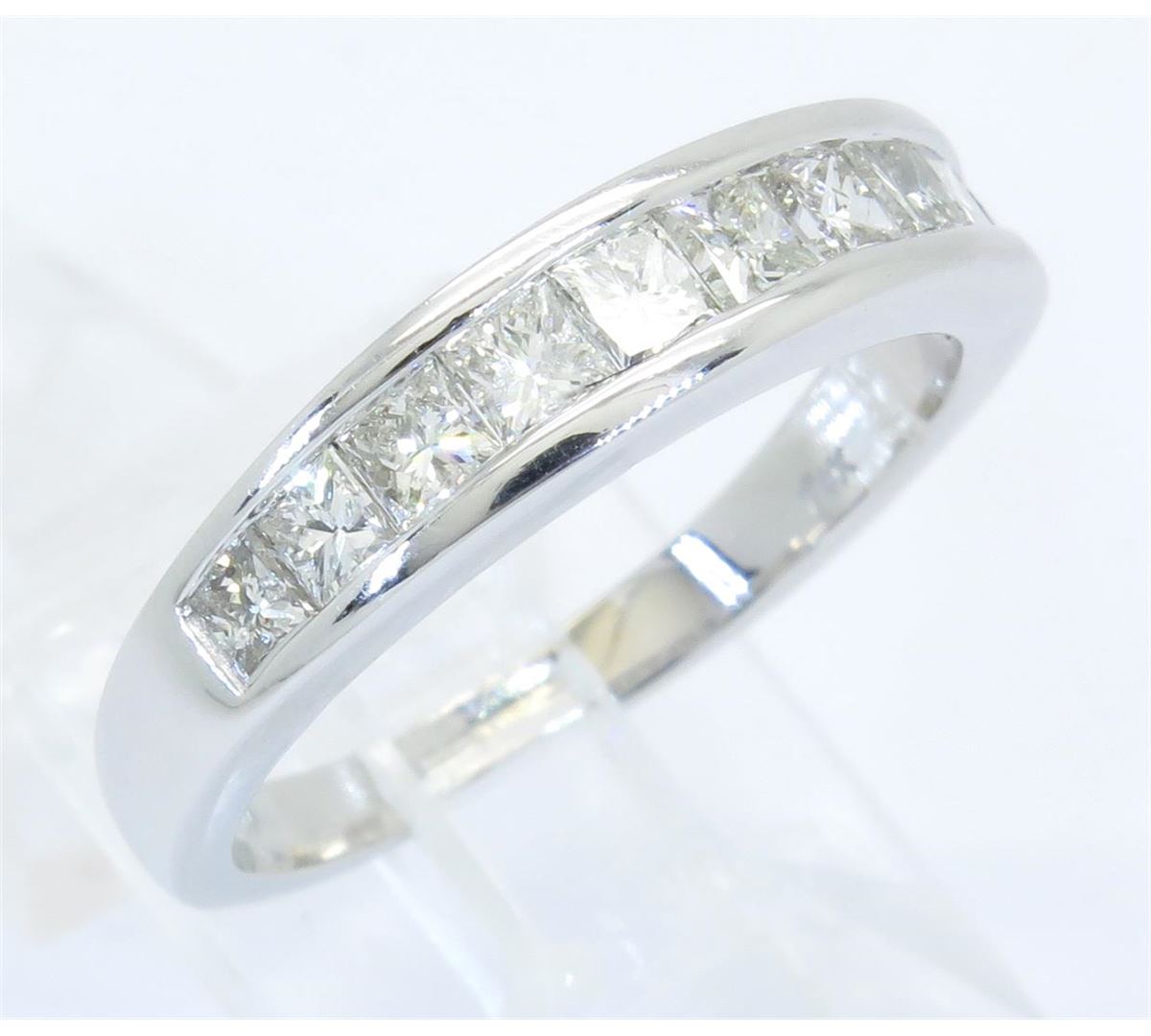 One tested 14K white gold diamond band. Containing:10 Princess Cut Diamonds, Clarity: I, Color: G-H. Approximate total diamond weight: 1CTW. All diamonds are graded in the mounting unless otherwise stated. Weight of ring: 4.1 grams, Size: 7.0.