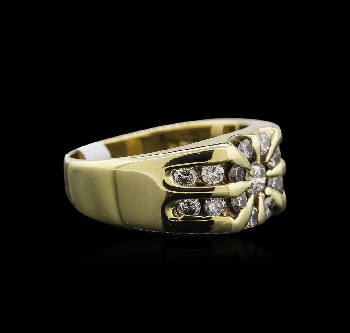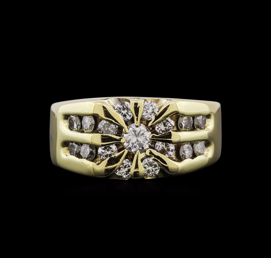 One electronically tested 14KT yellow gold man's cast fashion ring with a tapered shank with a bright polish finish. Condition is new. Identified with markings of "14K". Containing: One channel set round brilliant cut diamond, measuring 3.90 - 3.80 x 2.31mm (depth est.) approximate weight of 0.20ct. Graded in the setting. Clarity: SI-2. Color: H. Cut: Good. Sixteen channel set round brilliant cut diamonds, measuring 2.40 - 2.35 x 1.43mm (depth est.) approximate total weight of 16 Stones = 0.80ct. Graded in the setting. Clarity: SI-2 to I-1. Color: I - J. Cut: Good. Total Weight of Diamonds: 1.00ct. Total Weight of Ring: 10.70 gm. GAS Appraised at $5,480.00.
