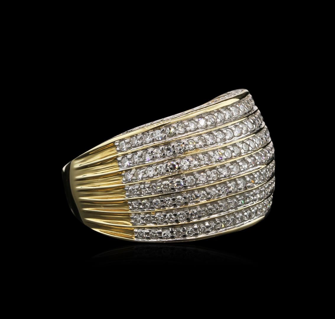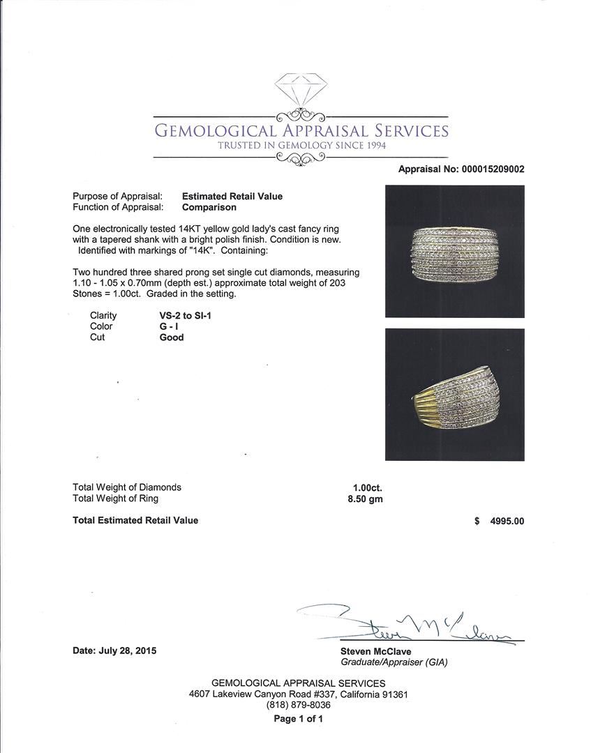 One electronically tested 14KT yellow gold lady's cast fancy ring with a tapered shank with a bright polish finish. Identified with markings of "14K". Condition is new. Containing: Two Hundred Three shared prong set single cut diamonds, measuring 1.10 - 1.05 x 0.70mm (depth est.) approximate. Total Weight of 203 Stones = 1.00ct. Graded in the setting. Clarity: VS-2 to SI-1. Color: G - I. Cut Good. Total Weight of Diamonds 1.00ct. Total Weight of Ring 8.50gm. GAS Appraised at $4,995.00.