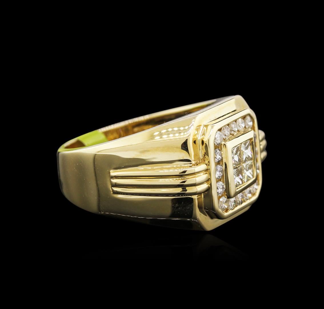One electronically tested 14KT Yellow gold man's cast fashion ring with a tapered shank with a bright polish finish. Condition is new. Identified with markings of "14K". Containing: Four channel set princess cut diamonds, measuring 2.70 x 2.65 x 1.99mm (depth est.) approximate total weight of 4 Stones = 0.50ct. Graded in the setting. Clarity: VS-2 to SI-2. Color: J - K. Cut: Good. Sixteen channel set round brilliant cut diamonds, measuring 2.00 - 1.95 x 1.19mm (depth est.) approximate total weight of 16 Stones = 0.50ct. Graded in the setting. Clarity: SI-2 to I-1. Color: H - J. Cut: Good. Total Weight of Diamonds: 1.00ct. Total Weight of Ring: 10.30 gm. GAS Appraised at $5,455.00.