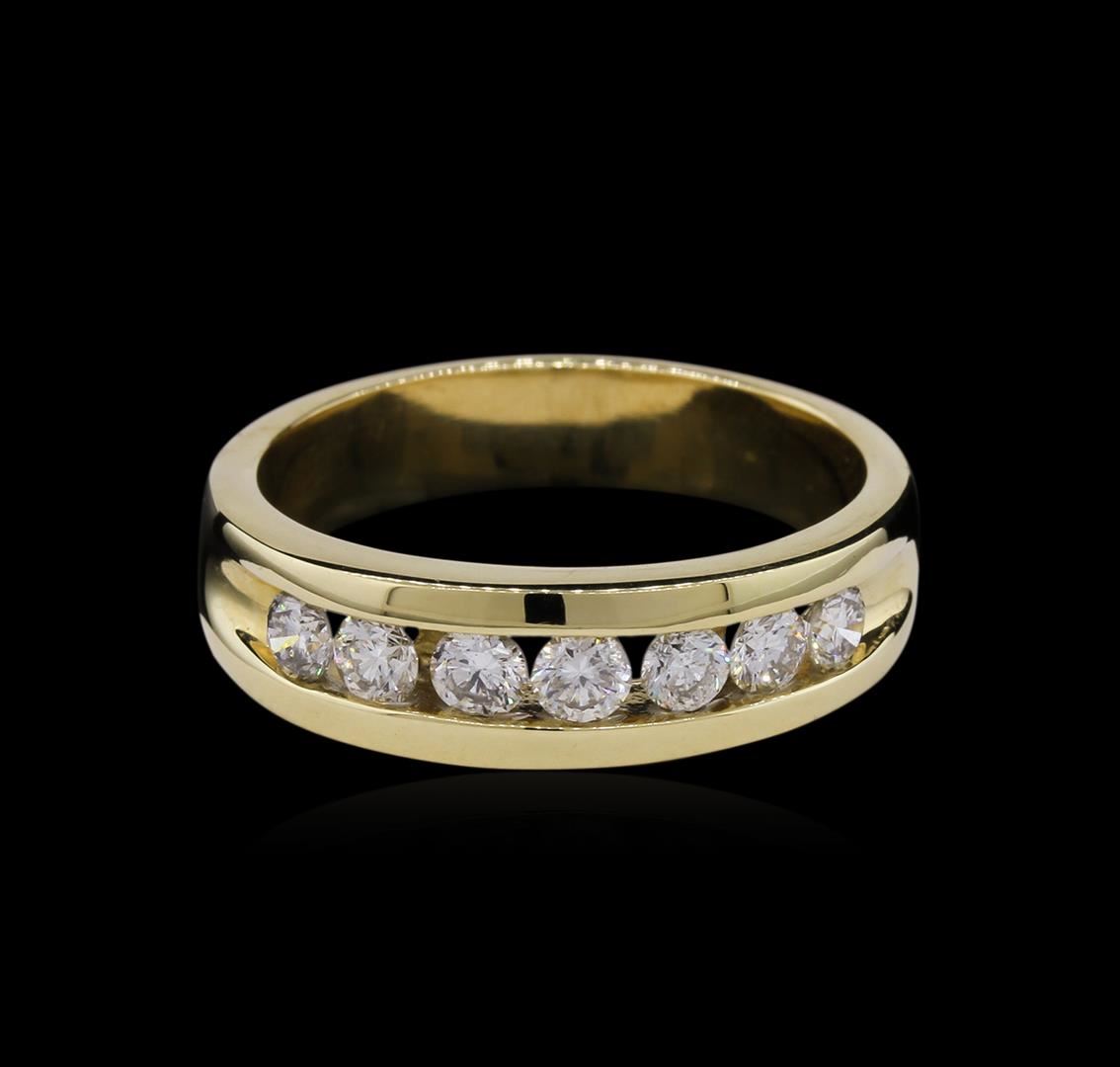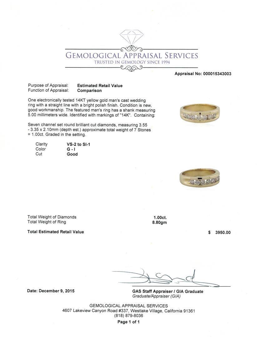 One electronically tested 14KT yellow gold man's cast wedding ring with a straight line with a bright polish finish. The featured man's ring has a shank measuring 5.00 millimeters wide. Identified with markings of "14K". Condition is new, good workmanship. Containing: Seven channel set round brilliant cut diamonds, measuring 3.55 - 3.35 x 2.10mm (depth est.) approximate total weight of 7 Stones = 1.00ct. Graded in the setting. Clarity: VS-2 to SI-1. Color: G - I. Cut Good. Total Weight of Diamonds 1.00ct. Total Weight of Ring 8.80gm. GAS Appraised at $3,950.00.