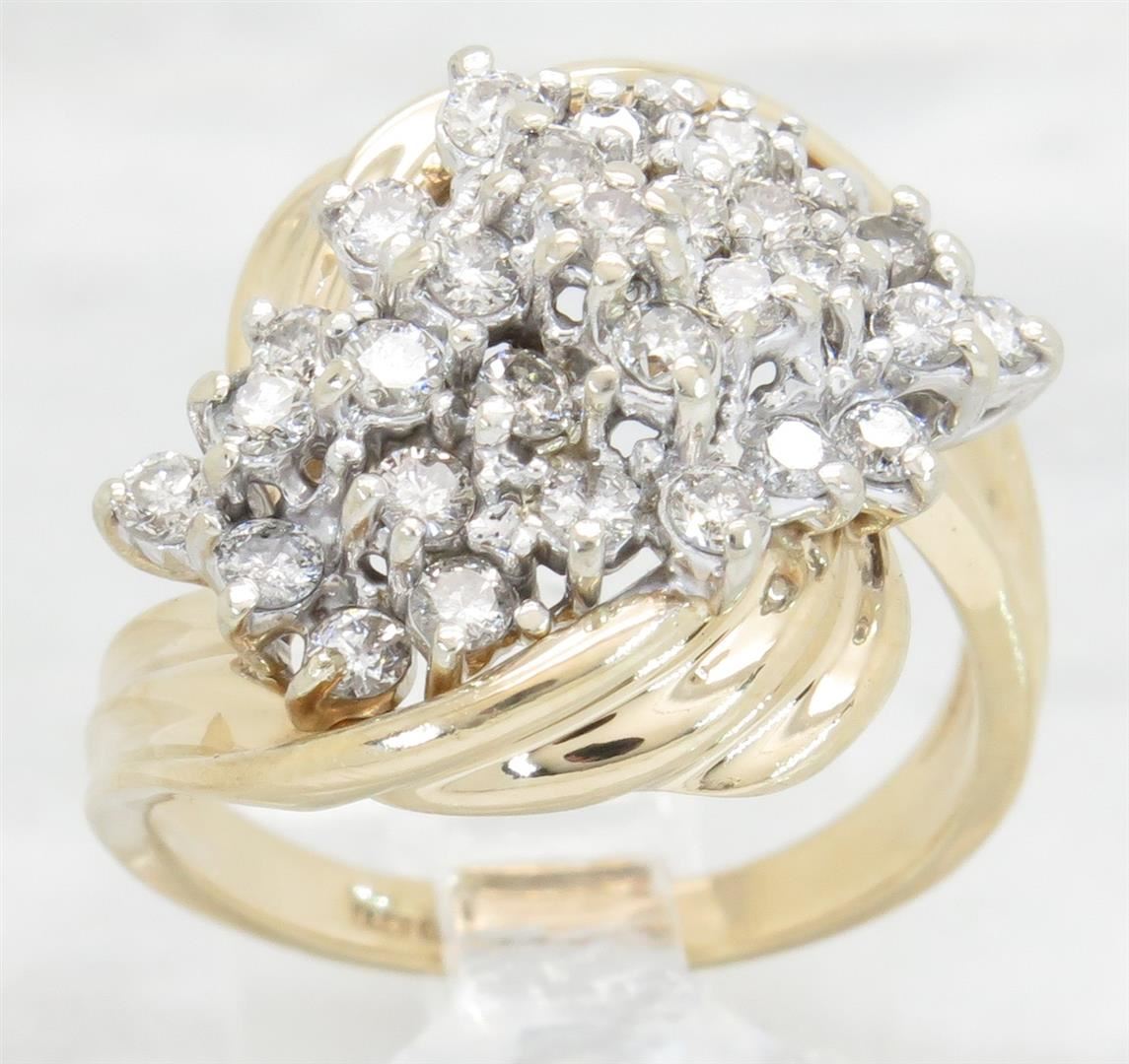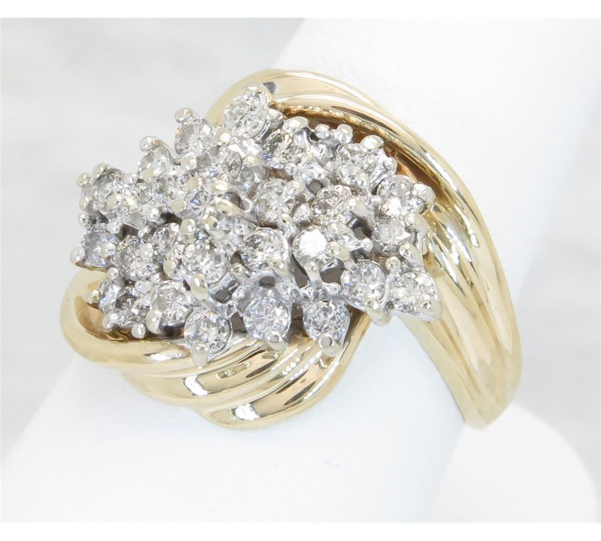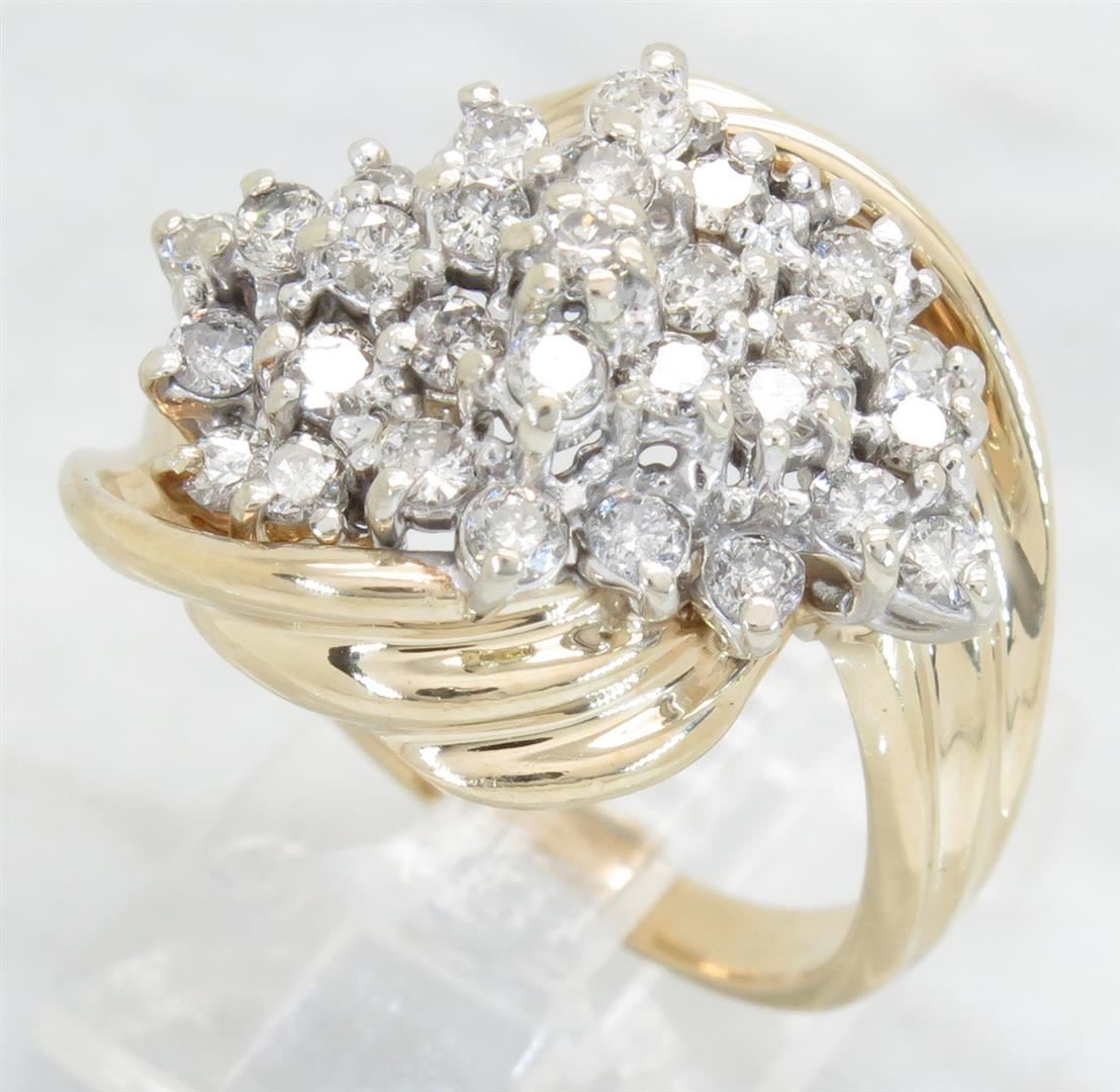 One tested 14K yellow gold diamond ring. Containing: 29 Round Brilliant Cut Diamonds. Clarity: I, Color: G-I. Approximate total diamond weight: 1.00CTW. Diamonds are graded in the mounting, unless otherwise stated. Weight of ring: 6.9 grams. Size: 6.5.