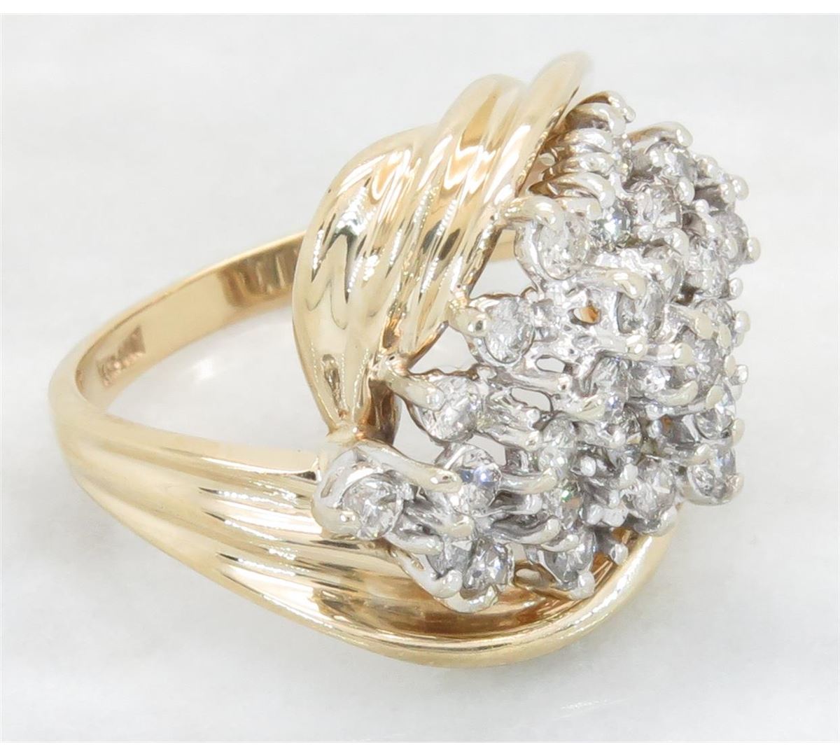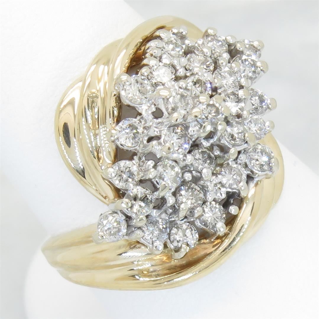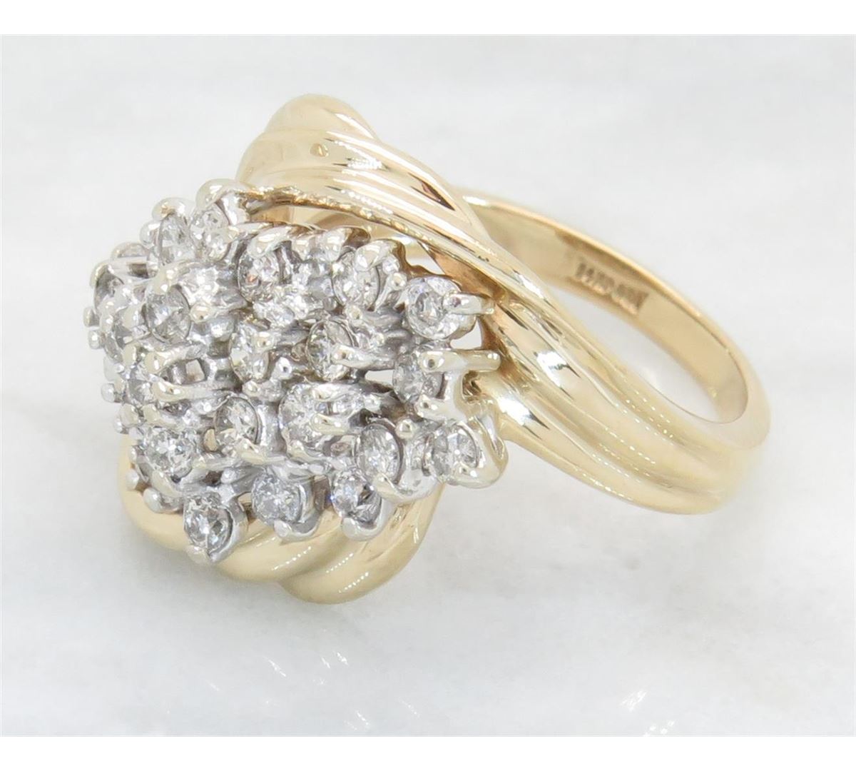 One tested 14K yellow gold diamond ring. Containing: 29 Round Brilliant Cut Diamonds. Clarity: I, Color: G-I. Approximate total diamond weight: 1.00CTW. Diamonds are graded in the mounting, unless otherwise stated. Weight of ring: 6.9 grams. Size: 6.5.