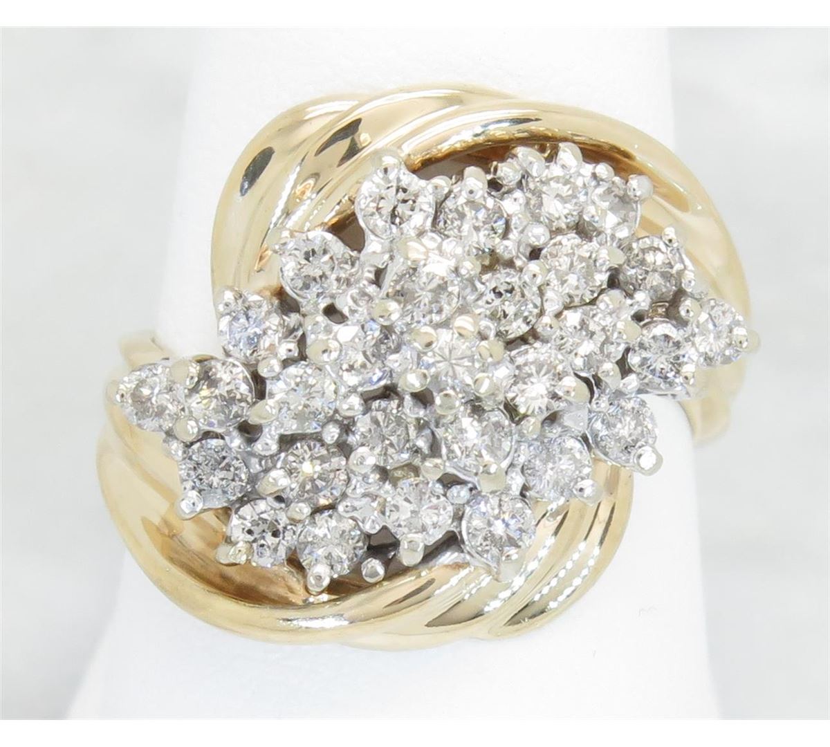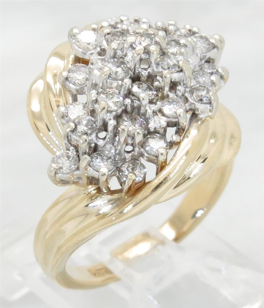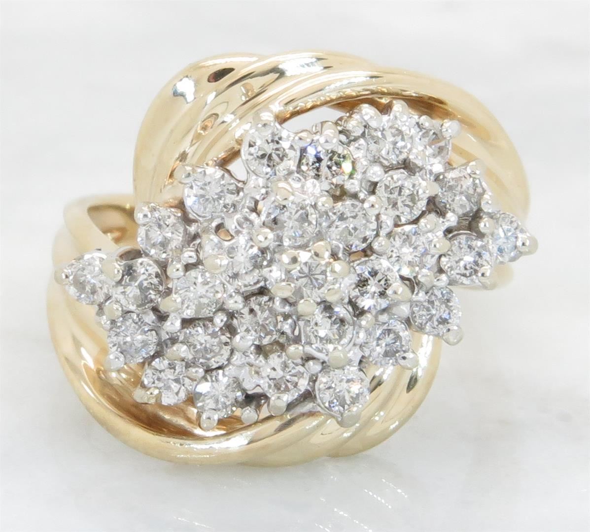 One tested 14K yellow gold diamond ring. Containing: 29 Round Brilliant Cut Diamonds. Clarity: I, Color: G-I. Approximate total diamond weight: 1.00CTW. Diamonds are graded in the mounting, unless otherwise stated. Weight of ring: 6.9 grams. Size: 6.5.