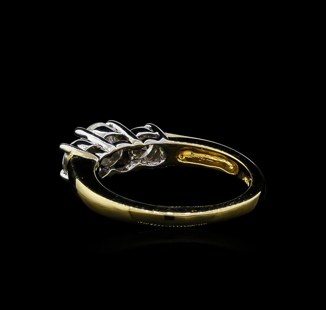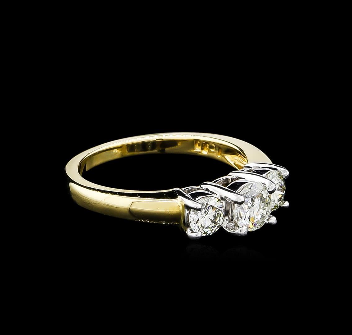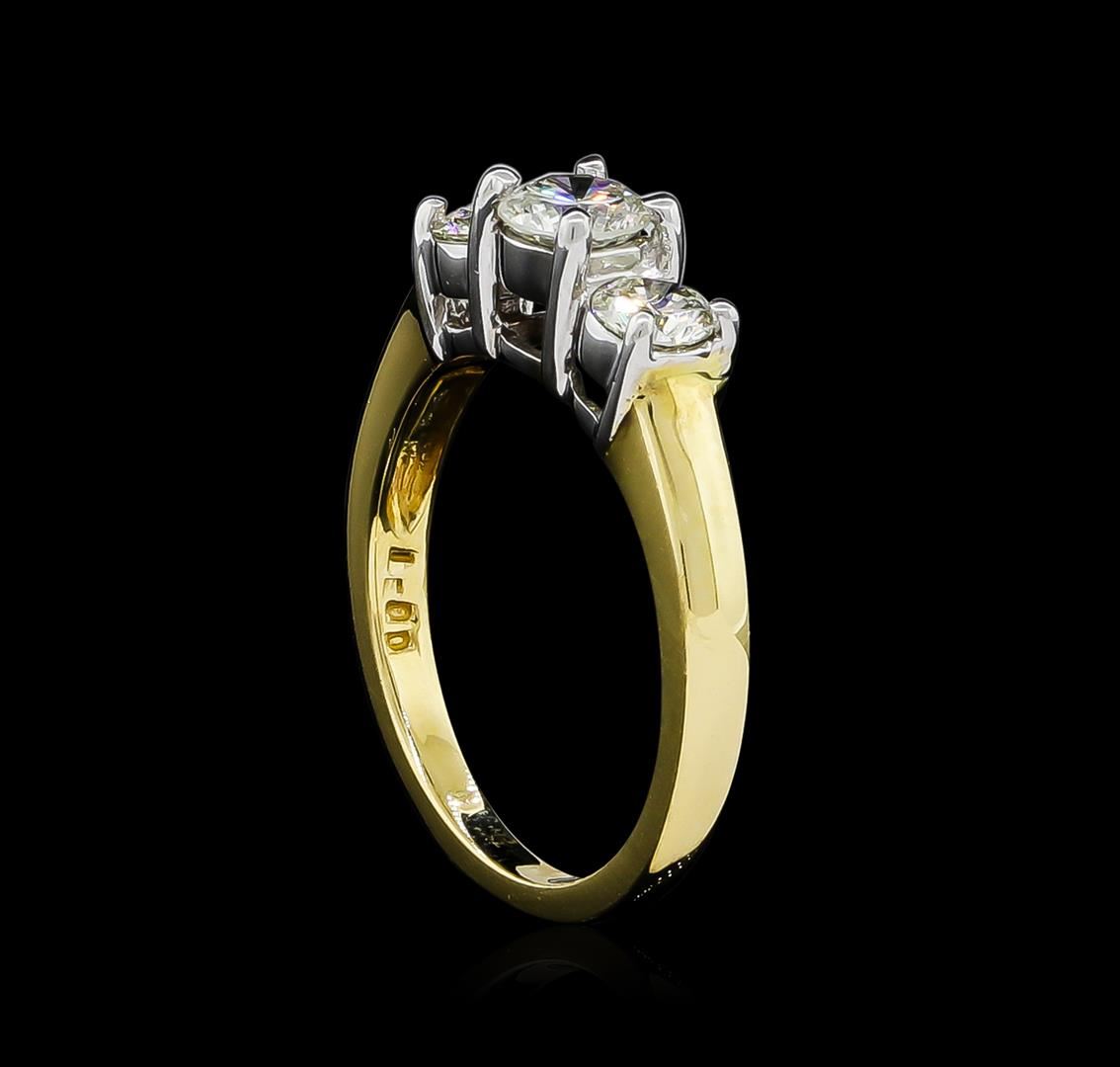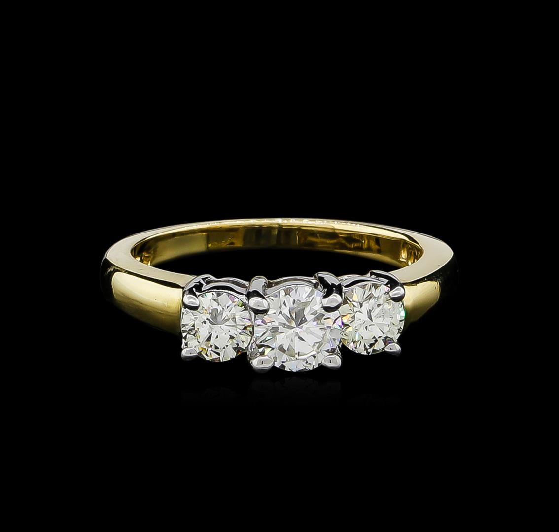 One electronically tested 14KT yellow gold ladies cast three diamond ring. The ring features a diamond trio, completed by a two millimeter wide band. Bright polish finish with rhodium accents. Identified with markings of "14K". Condition is good. Containing: One prong set round brilliant cut diamond, measuring 5.00 - 4.90 x 2.85mm (depth est.), 3.00.%. GTCF approximate weight of 0.48ct. Graded in the setting. Clarity: SI-2. Color: I Two prong set round brilliant cut diamonds, measuring 4.00 - 3.90 x 2.45mm (depth est.) approximate total weight of 2 Stones = 0.52ct. Graded in the setting. Clarity: SI-1 to SI-2. Color: I - J. Total Weight of Diamonds 1.00ct. Total Weight of Ring 3.82gm. AIG Appraised at $4,610.00.