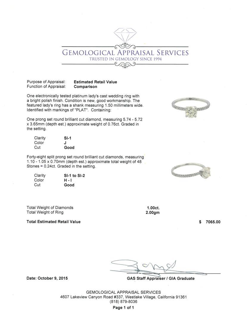 One electronically tested platinum lady's cast wedding ring with a bright polish finish. The featured lady's ring has a shank measuring 1.50 millimeters wide. Identified with markings of "PLAT". Condition is new, good workmanship. Containing: One prong set round brilliant cut diamond, measuring 5.74 - 5.72 x 3.65mm (depth est.) approximate weight of 0.76ct. Graded in the setting. Clarity: SI-1. Color: Good Forty-Eight split prong set round brilliant cut diamonds, measuring 1.10 - 1.05 x 0.70mm (depth est.) approximate total weight of 48 Stones = 0.24ct. Graded in the setting. Clarity: SI-1 to SI-2. Color: H - I. Cut Good. Total Weight of Diamonds 1.00ct. Total Weight of Ring 2.00gm. GAS Appraised at $7,065.00.
