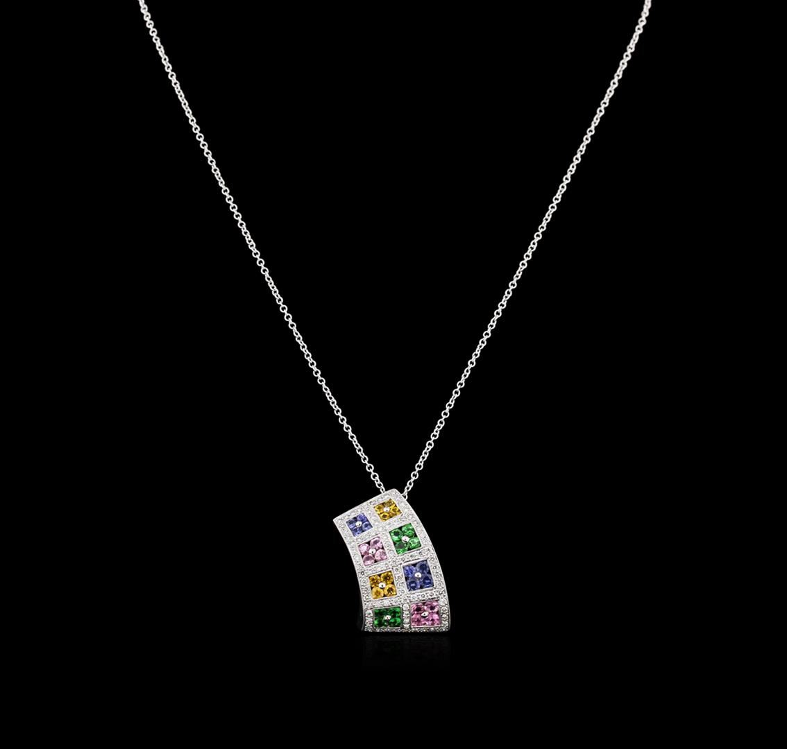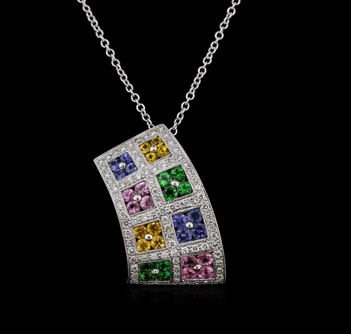One pendant with chain featuring: 14KT white gold weighing 7.40 grams containing multi-colored sapphires with a total weight of 1.00ct and diamonds with a total weight of 0.80ct.