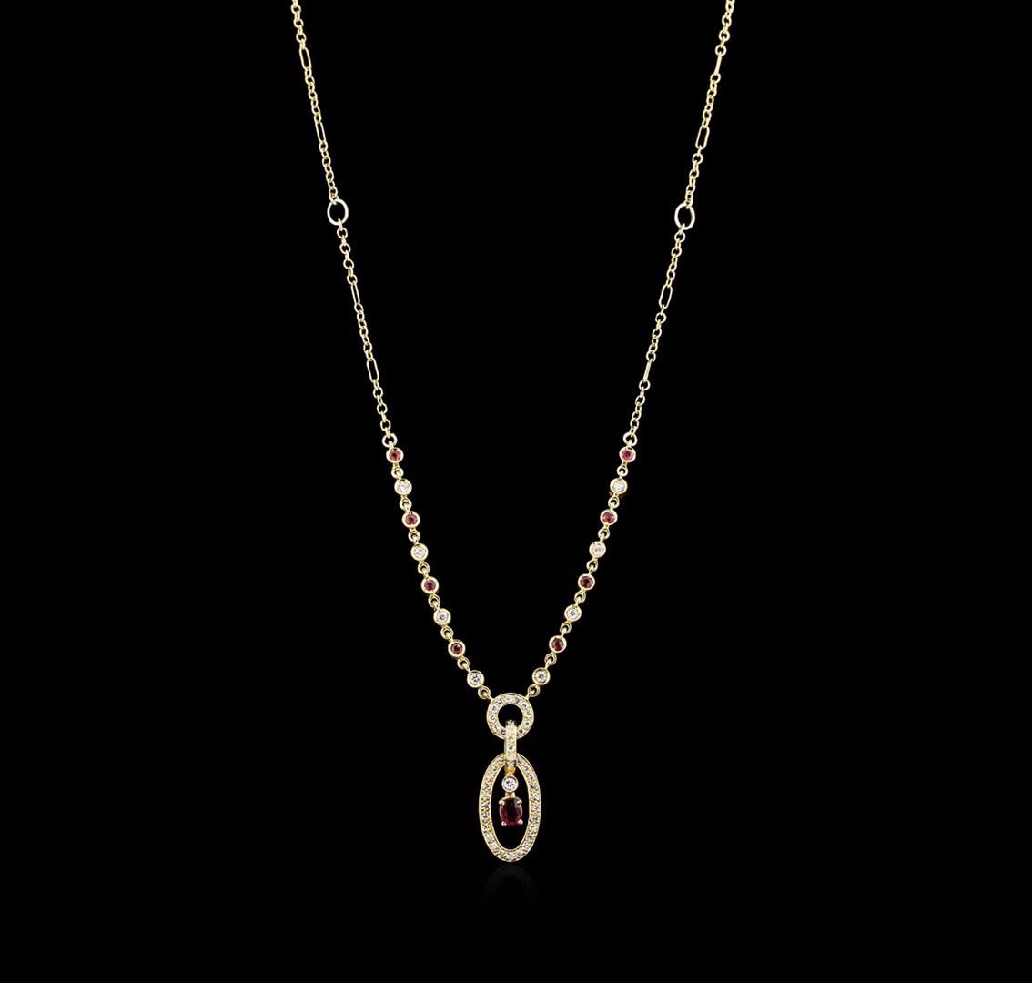 One electronically tested 18KT yellow gold lady's combination cast & assembled fashion necklace with a spring ring clasp with a bright polish finish. The featured lady's necklace has an attached diamond cut cable link chain measuring 19 inches in length. Identified with markings of "750". Condition is new, good workmanship. Containing: One prong set rectangular cushion modified brilliant cut natural ruby, measuring 6.13 x 4.36 x 2.25mm, approximate weight of 0.52ct., clarity is slightly included, type II, medium, very slightly brownish, slightly purplish red color, (GIA slpR 5/3), cut is good. Naturally occurring internal & external characteristics are present. Colored gemstones are presumed to have been subjected to commonly used enhancement processes. Graded in the setting. Eight prong set round brilliant cut natural rubies, measuring 2.50 - 2.40 x 1.13 mm, approximate total weight of 0.48ct., clarity is moderately included, type II, medium, very slightly brownish, slightly purplish red color, (GIA slpR 5/3), cut is good. Naturally occurring internal & external characteristics are present. Colored gemstones are presumed to have been subjected to commonly used enhancement processes. Graded in the setting. Nine prong set round brilliant cut diamonds, measuring 2.30 - 2.20 x 1.40mm (depth est.) approximate total weight of 9 Stones = 0.39ct. Graded in the setting. Clarity: VS-1 to VS-2. Color: G - Very Good Forty bead set round brilliant cut diamonds, measuring 1.60 - 1.55 x 1.03mm (depth est.) approximate total weight of 40 Stones = 0.62ct. Graded in the setting. Clarity: VS-2 to SI-1. Color: G - Good. Total Weight of Colored Stones 1.00ct. Total Weight of Diamonds 1.01ct. Total Weight of Necklace 17.60gm. GAS Appraised at $5,945.00.