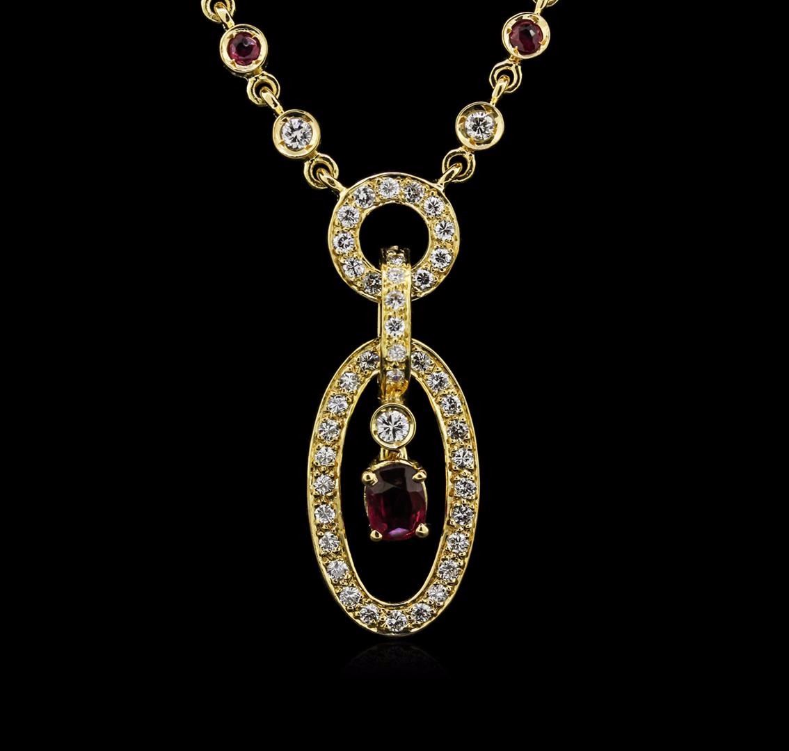 One electronically tested 18KT yellow gold lady's combination cast & assembled fashion necklace with a spring ring clasp with a bright polish finish. The featured lady's necklace has an attached diamond cut cable link chain measuring 19 inches in length. Identified with markings of "750". Condition is new, good workmanship. Containing: One prong set rectangular cushion modified brilliant cut natural ruby, measuring 6.13 x 4.36 x 2.25mm, approximate weight of 0.52ct., clarity is slightly included, type II, medium, very slightly brownish, slightly purplish red color, (GIA slpR 5/3), cut is good. Naturally occurring internal & external characteristics are present. Colored gemstones are presumed to have been subjected to commonly used enhancement processes. Graded in the setting. Eight prong set round brilliant cut natural rubies, measuring 2.50 - 2.40 x 1.13 mm, approximate total weight of 0.48ct., clarity is moderately included, type II, medium, very slightly brownish, slightly purplish red color, (GIA slpR 5/3), cut is good. Naturally occurring internal & external characteristics are present. Colored gemstones are presumed to have been subjected to commonly used enhancement processes. Graded in the setting. Nine prong set round brilliant cut diamonds, measuring 2.30 - 2.20 x 1.40mm (depth est.) approximate total weight of 9 Stones = 0.39ct. Graded in the setting. Clarity: VS-1 to VS-2. Color: G - Very Good Forty bead set round brilliant cut diamonds, measuring 1.60 - 1.55 x 1.03mm (depth est.) approximate total weight of 40 Stones = 0.62ct. Graded in the setting. Clarity: VS-2 to SI-1. Color: G - Good. Total Weight of Colored Stones 1.00ct. Total Weight of Diamonds 1.01ct. Total Weight of Necklace 17.60gm. GAS Appraised at $5,945.00.