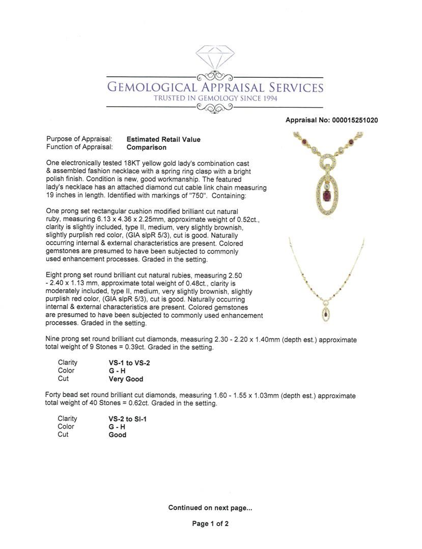 One electronically tested 18KT yellow gold lady's combination cast & assembled fashion necklace with a spring ring clasp with a bright polish finish. The featured lady's necklace has an attached diamond cut cable link chain measuring 19 inches in length. Identified with markings of "750". Condition is new, good workmanship. Containing: One prong set rectangular cushion modified brilliant cut natural ruby, measuring 6.13 x 4.36 x 2.25mm, approximate weight of 0.52ct., clarity is slightly included, type II, medium, very slightly brownish, slightly purplish red color, (GIA slpR 5/3), cut is good. Naturally occurring internal & external characteristics are present. Colored gemstones are presumed to have been subjected to commonly used enhancement processes. Graded in the setting. Eight prong set round brilliant cut natural rubies, measuring 2.50 - 2.40 x 1.13 mm, approximate total weight of 0.48ct., clarity is moderately included, type II, medium, very slightly brownish, slightly purplish red color, (GIA slpR 5/3), cut is good. Naturally occurring internal & external characteristics are present. Colored gemstones are presumed to have been subjected to commonly used enhancement processes. Graded in the setting. Nine prong set round brilliant cut diamonds, measuring 2.30 - 2.20 x 1.40mm (depth est.) approximate total weight of 9 Stones = 0.39ct. Graded in the setting. Clarity: VS-1 to VS-2. Color: G - Very Good Forty bead set round brilliant cut diamonds, measuring 1.60 - 1.55 x 1.03mm (depth est.) approximate total weight of 40 Stones = 0.62ct. Graded in the setting. Clarity: VS-2 to SI-1. Color: G - Good. Total Weight of Colored Stones 1.00ct. Total Weight of Diamonds 1.01ct. Total Weight of Necklace 17.60gm. GAS Appraised at $5,945.00.