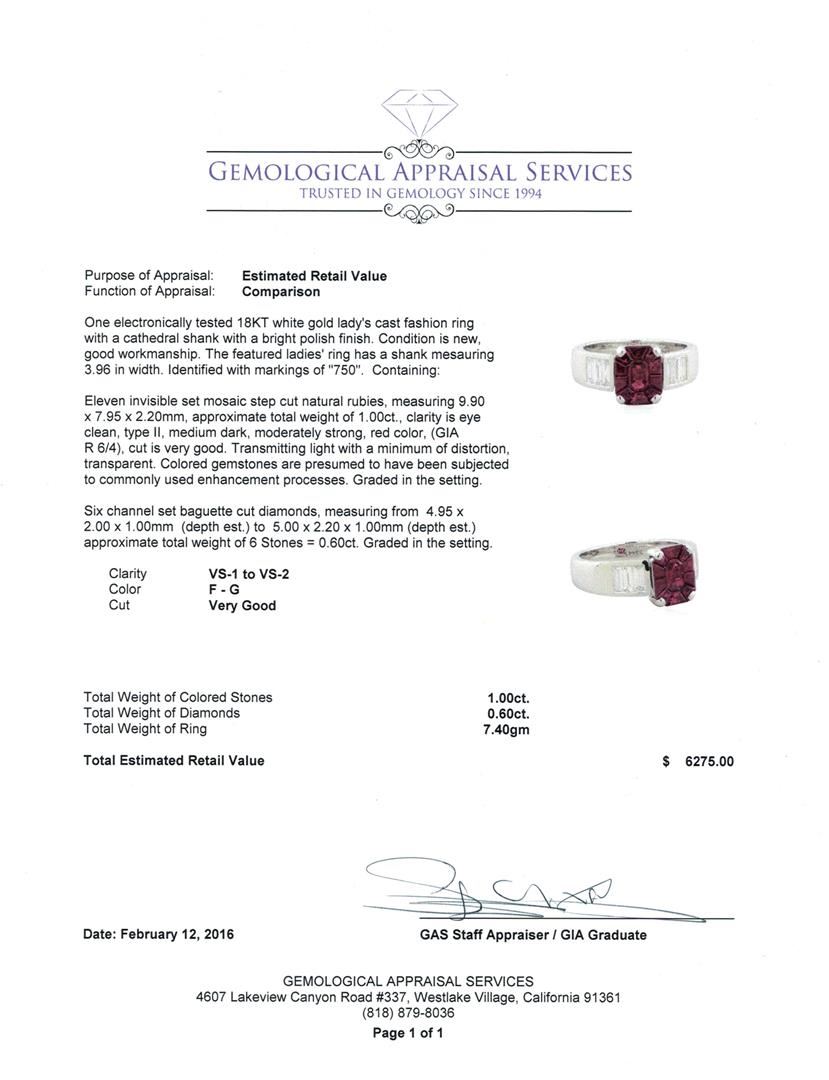 One electronically tested 18KT white gold lady's cast fashion ring with a cathedral shank with a bright polish finish. The featured ladies' ring has a shank measuring 3.96 in width. Identified with markings of "750". Condition is new, good workmanship. Containing: Eleven invisible set mosaic step cut natural rubies, measuring 9.90 x 7.95 x 2.20mm, approximate total weight of 1.00ct., clarity is eye clean, type II, medium dark, moderately strong, red color, (GIA R 6/4), cut is very good. Transmitting light with a minimum of distortion, transparent. Colored gemstones are presumed to have been subjected to commonly used enhancement processes. Graded in the setting. Six channel set baguette cut diamonds, measuring from 4.95 x 2.00 x 1.00mm (depth est.) to 5.00 x 2.20 x 1.00mm (depth est.) approximate total weight of 6 Stones = 0.60ct. Graded in the setting. Clarity: VS-1 to VS-2. Color: F - Very Good. Total Weight of Colored Stones 1.00ct. Total Weight of Diamonds 0.60ct. Total Weight of Ring 7.40gm. GAS Appraised at $6,275.00.
