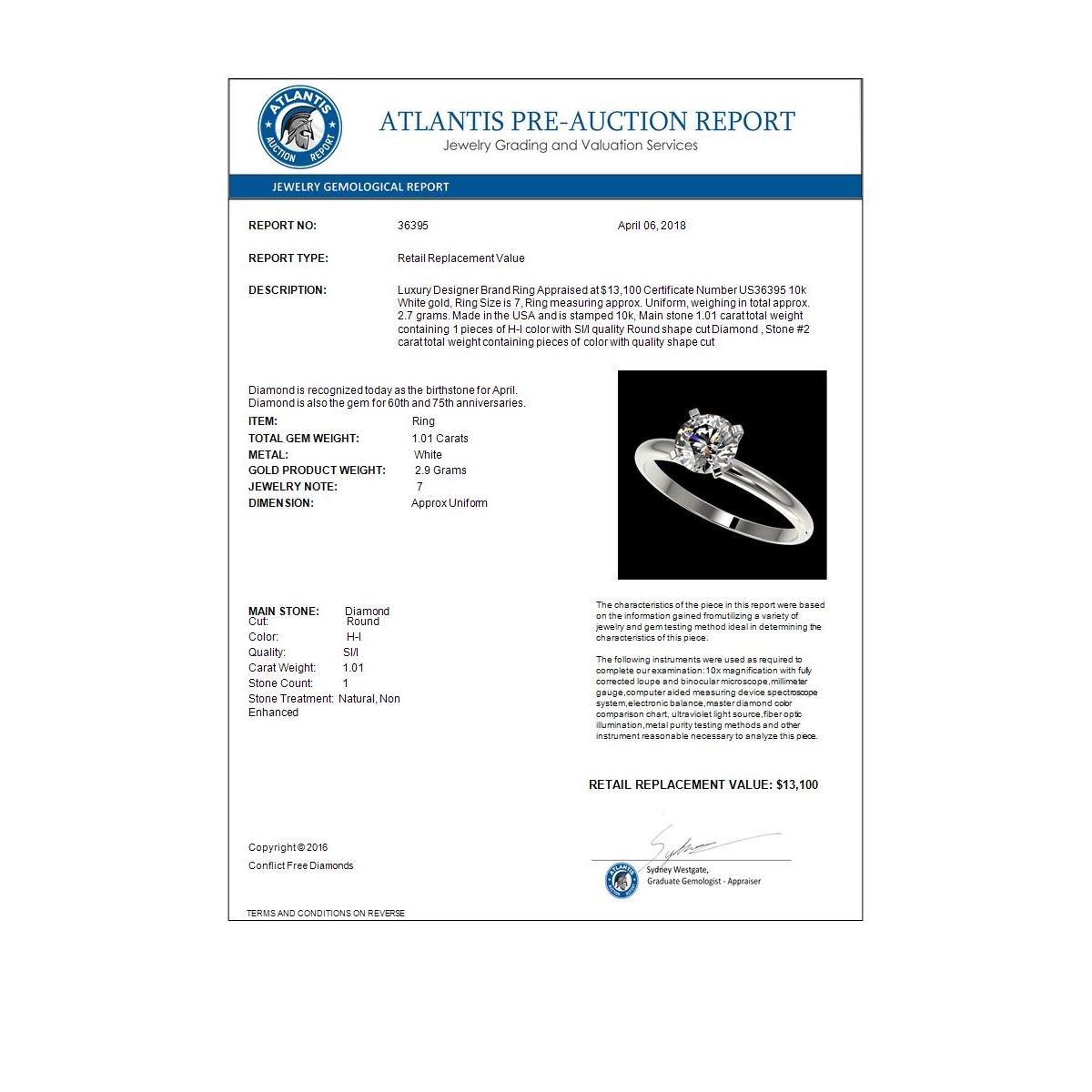 REF-216W4F -36395 ---- 1.01 CTW Certified H-SI/I Quality Diamond Solitaire Engagement Ring 10K White Gold ---- Luxury Designer Brand Ring Appraised at $13,100 Certificate Number US36395 10k White gold, Ring Size is 7, Ring measuring approx. Uniform, weighing in total approx. 2.7 grams. Made in the USA and is stamped 10k, Main stone 1.01 carat total weight containing 1 pieces of H-I color with SI/I quality Round shape cut Diamond , Stone #2 carat total weight containing pieces of color with quality shape cut