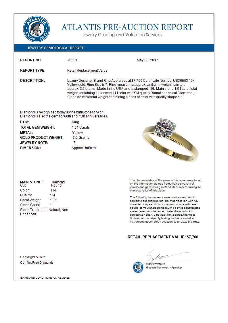 1.01 CTW Certified H-SI/I Quality Diamond Solitaire Engagement Ring 10K Yellow Gold ---- Luxury Designer Brand Ring Appraised Retail Price at $7,700 ---- SKU Number US36503 10k Yellow gold Ring Size is 7, Ring measuring approx. Uniform, weighing in total approx. 3.3 grams. Made in the USA and is stamped 10k, Main stone 1.01 carat total weight containing 1 pieces of H-I color with SI/I quality Round shape cut Diamond , Stone #2 carat total weight containing pieces of color with quality shape cut