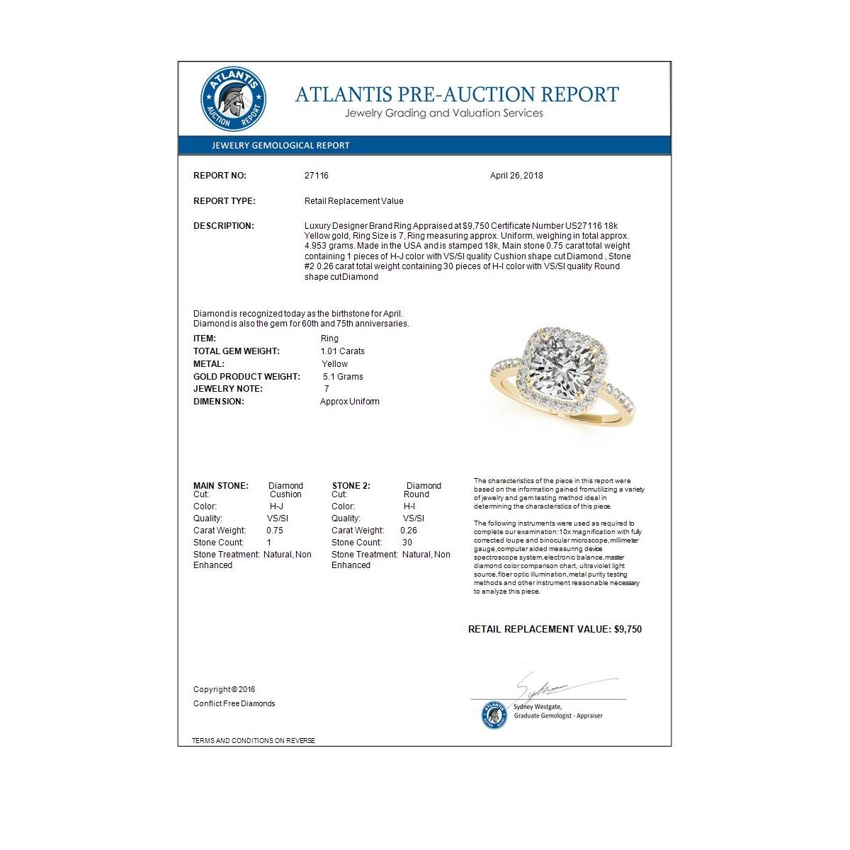 REF-222W2F -27116 ---- 1.01 CTW Certified VS/SI Cushion Diamond Solitaire Halo Ring 18K Yellow Gold ---- Luxury Designer Brand Ring Appraised at $9,750 Certificate Number US27116 18k Yellow gold, Ring Size is 7, Ring measuring approx. Uniform, weighing in total approx. 4.953 grams. Made in the USA and is stamped 18k, Main stone 0.75 carat total weight containing 1 pieces of H-J color with VS/SI quality Cushion shape cut Diamond , Stone #2 0.26 carat total weight containing 30 pieces of H-I color with VS/SI quality Round shape cut Diamond
