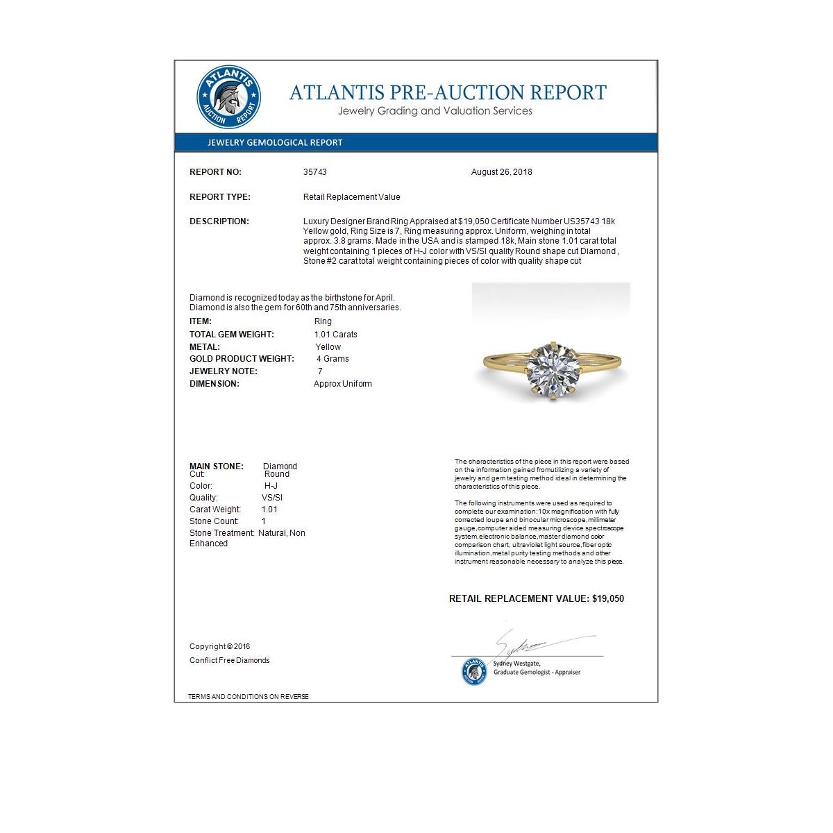 REF-286T3M -35743 ---- 1.01 CTW Certified VS/SI Diamond Engagement Ring 18K Yellow Gold ---- Luxury Designer Brand Ring Appraised at $19,050 Certificate Number US35743 18k Yellow gold, Ring Size is 7, Ring measuring approx. Uniform, weighing in total approx. 3.8 grams. Made in the USA and is stamped 18k, Main stone 1.01 carat total weight containing 1 pieces of H-J color with VS/SI quality Round shape cut Diamond , Stone #2 carat total weight containing pieces of color with quality shape cut