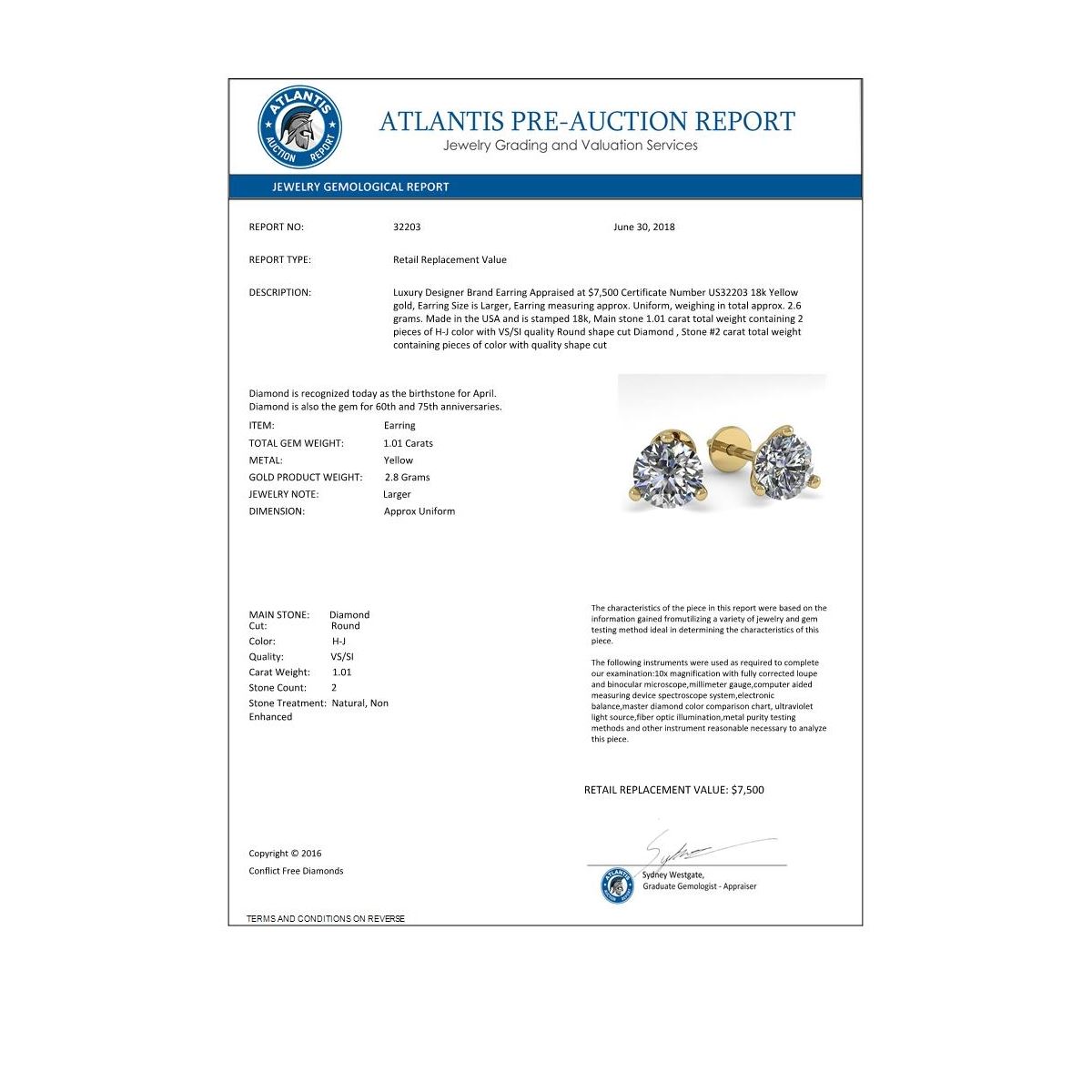 REF-151W8F -32203 ---- 1.01 CTW Certified VS/SI Diamond Stud Earrings 18K Yellow Gold ---- Luxury Designer Brand Earring Appraised at $7,500 Certificate Number US32203 18k Yellow gold, Earring Size is Larger, Earring measuring approx. Uniform, weighing in total approx. 2.6 grams. Made in the USA and is stamped 18k, Main stone 1.01 carat total weight containing 2 pieces of H-J color with VS/SI quality Round shape cut Diamond , Stone #2 carat total weight containing pieces of color with quality shape cut